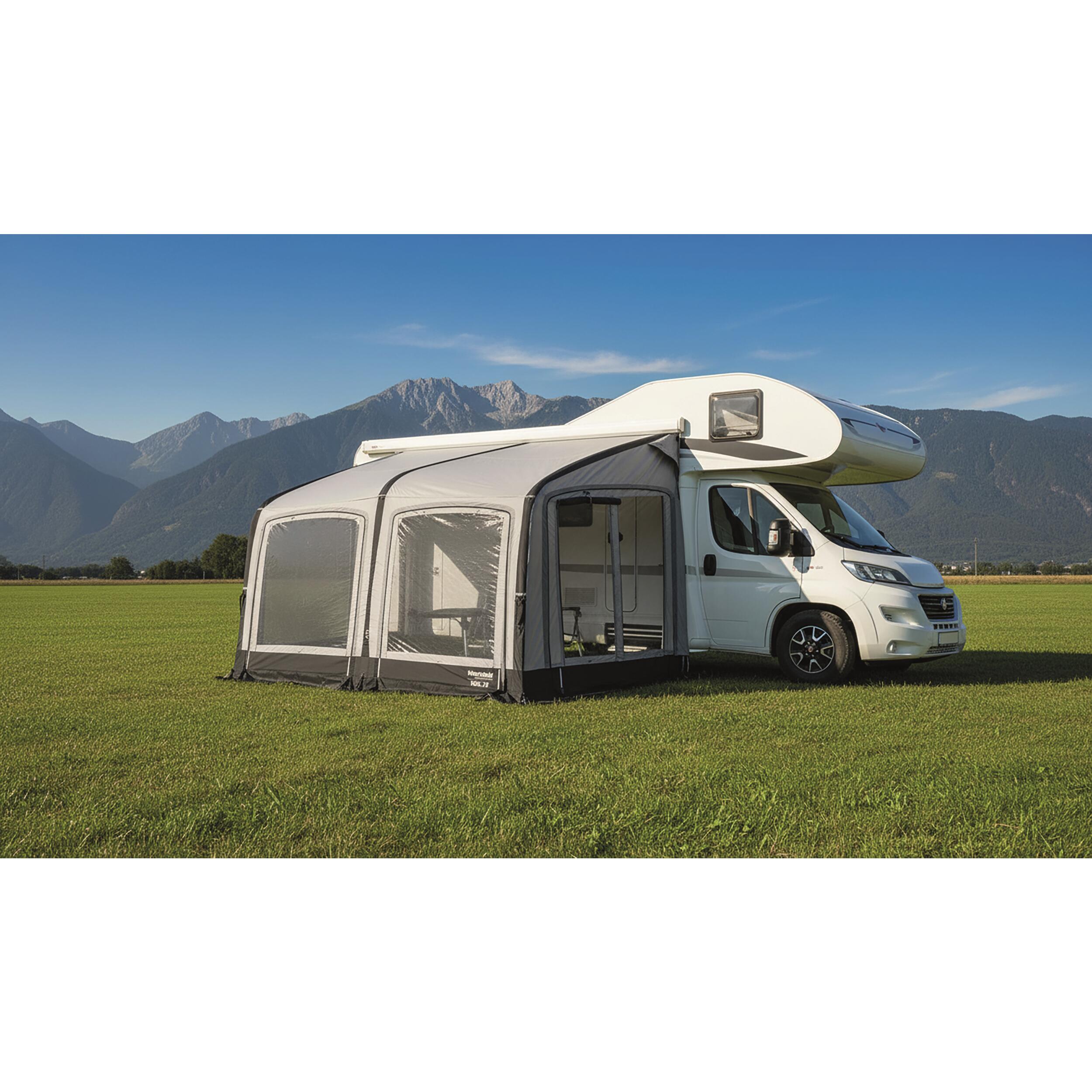 L'auvent gonflable VEGA est le choix idéal pour les personnes qui voyagent beaucoup et changent souvent d'endroit, car il peut être monté et démonté rapidement. Avec une profondeur de 250 cm, l'auvent offre beaucoup d'espace à l'intérieur. Les tubes gonflables sont conçus de manière à ce que vous puissiez vous tenir debout à une hauteur optimale et utiliser l'espace de manière optimale. Avec ses grandes fenêtres panoramiques, une grande sensation d'espace est garantie.