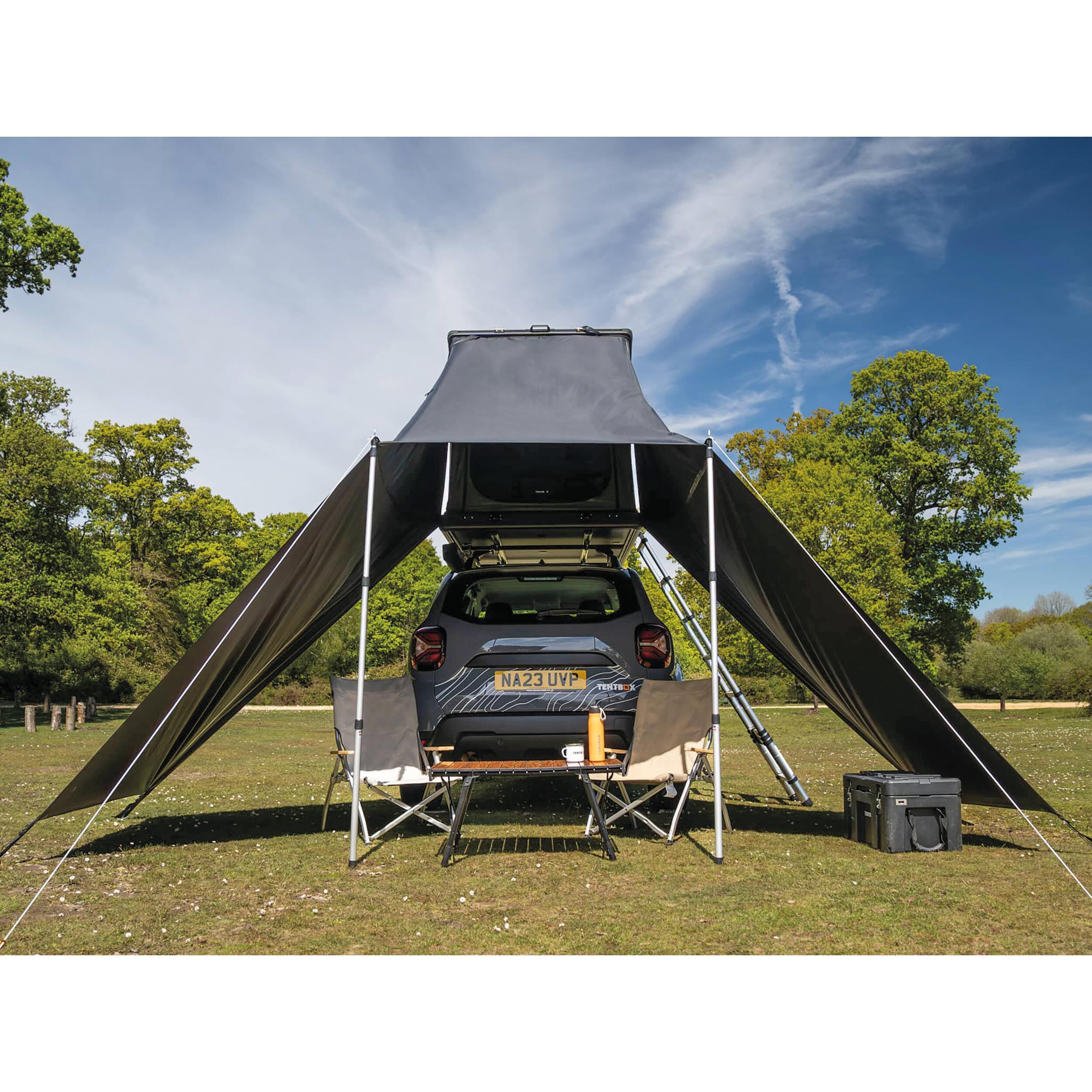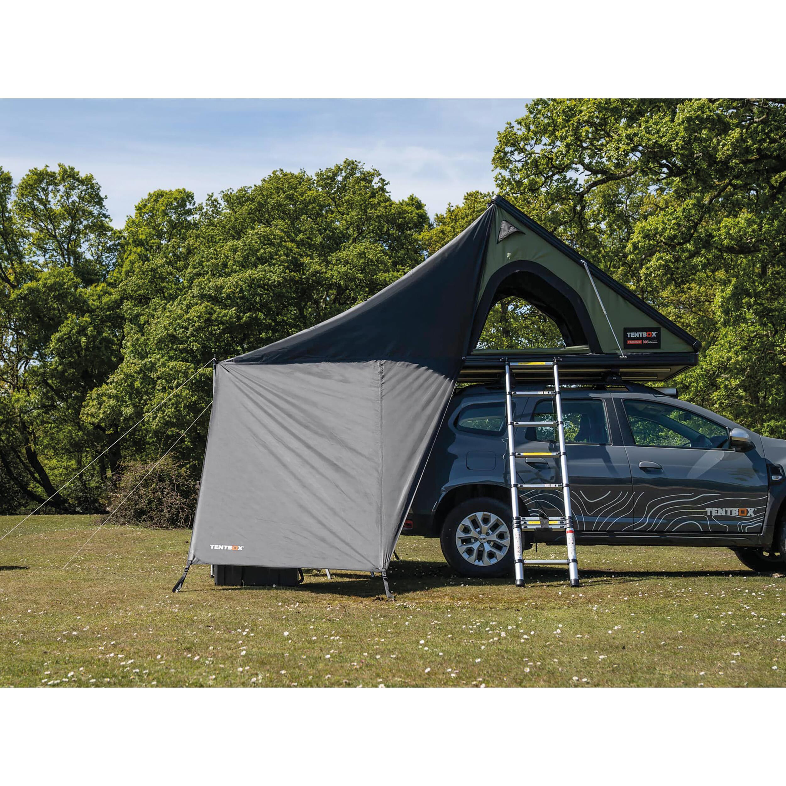 Auvent tunnel TentBox permettant de créer rapidement un espace abrité supplémentaire sous votre tente de toit.