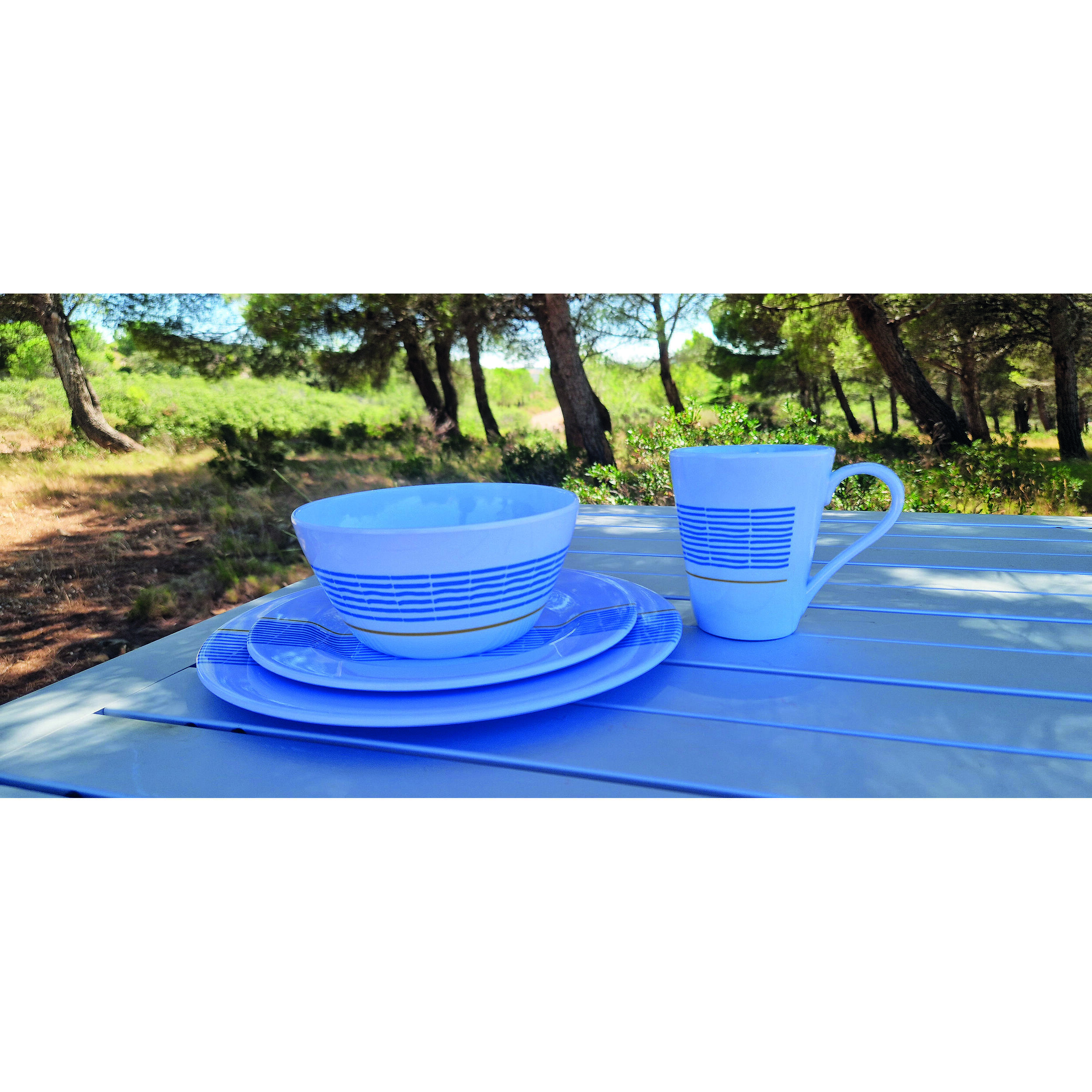 Avec ses motifs géométriques bleu et jaune sur fond blanc, ce service de vaisselle apporte une touche de convivialité et de chaleur à vos repas, où que vous soyez. Inspiré des ambiances ensoleillées du Sud, il transforme une simple pause déjeuner en moment agréable, même en pleine nature. Son style intemporel s’adapte aussi bien aux pique-niques improvisés qu’aux dîners organisés sur une aire de camping, tout en restant discret et élégant. Un détail qui fait la différence pour ceux qui aiment allier fonctionnalité et esthétique.