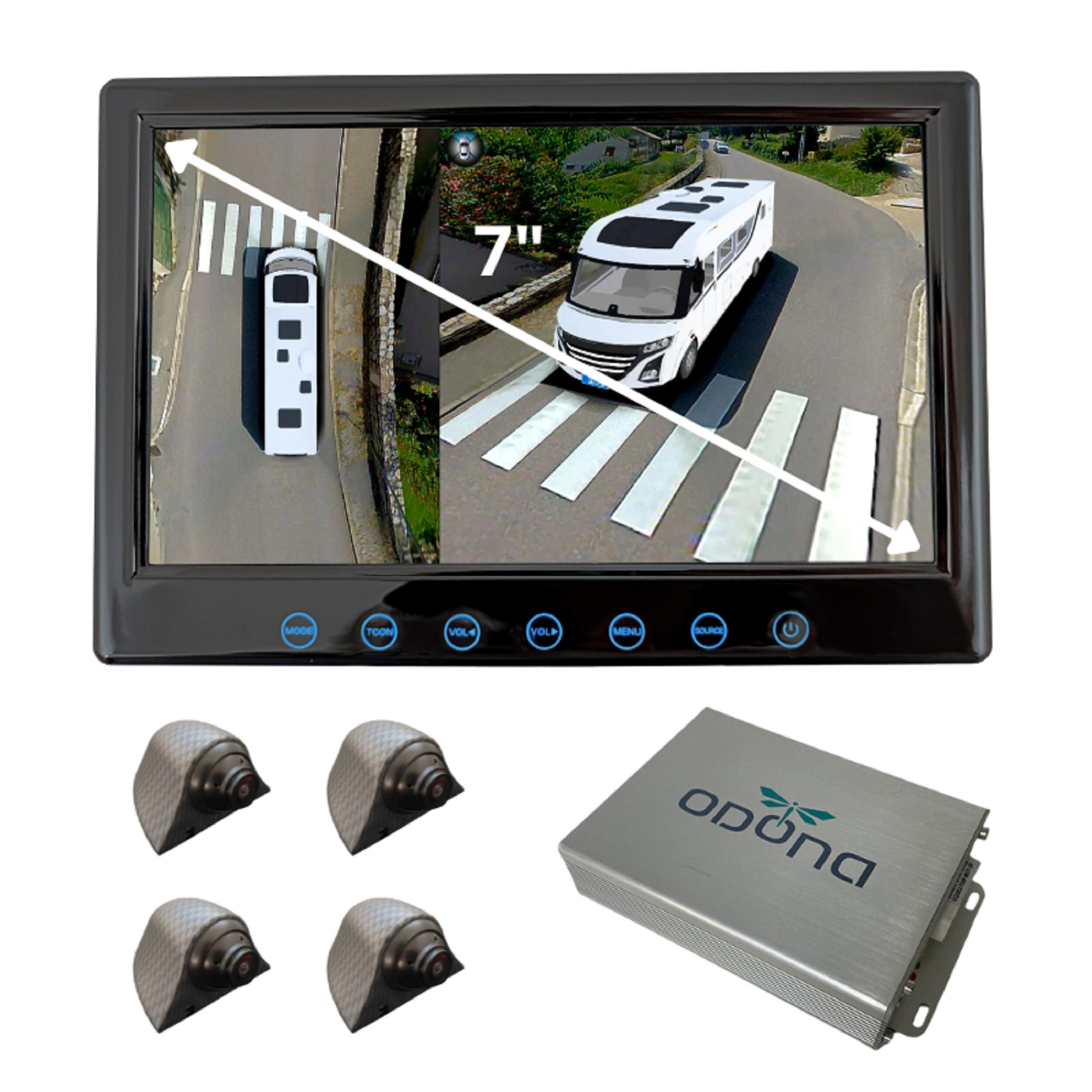 • Drone View V1 – La version originale, fiable et efficace La Drone View V1 est la version historique du système Odona. Elle offre l’essentiel de la technologie 360° : Vue aérienne reconstituée grâce à 4 caméras disposées autour du véhicule Aide au stationnement, manœuvres facilitées et élimination des angles morts Enregistrement sur carte SD pour une fonction dashcam simple et pratique Compatibilité avec écrans 7” ou 10” Installation standard et interface intuitive
