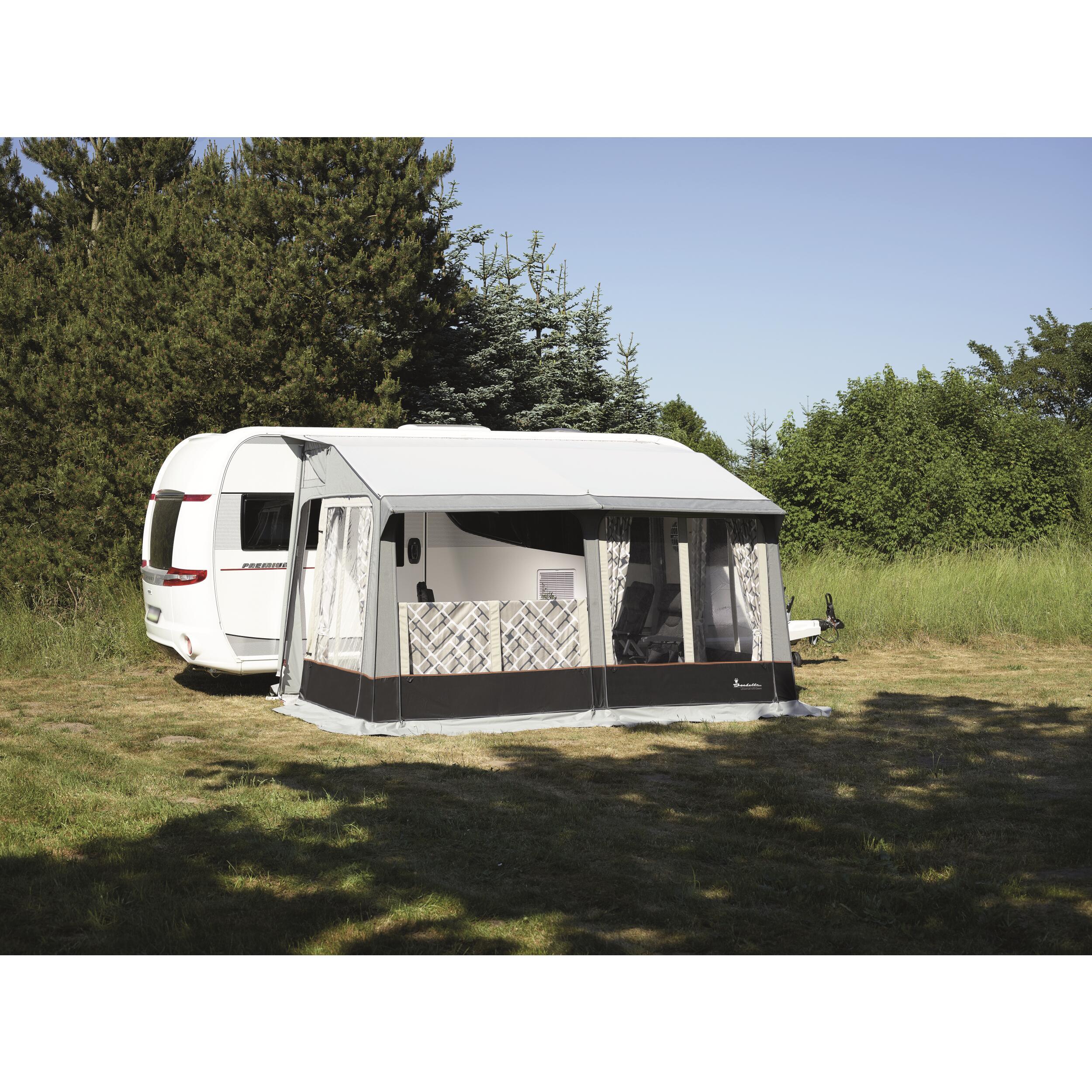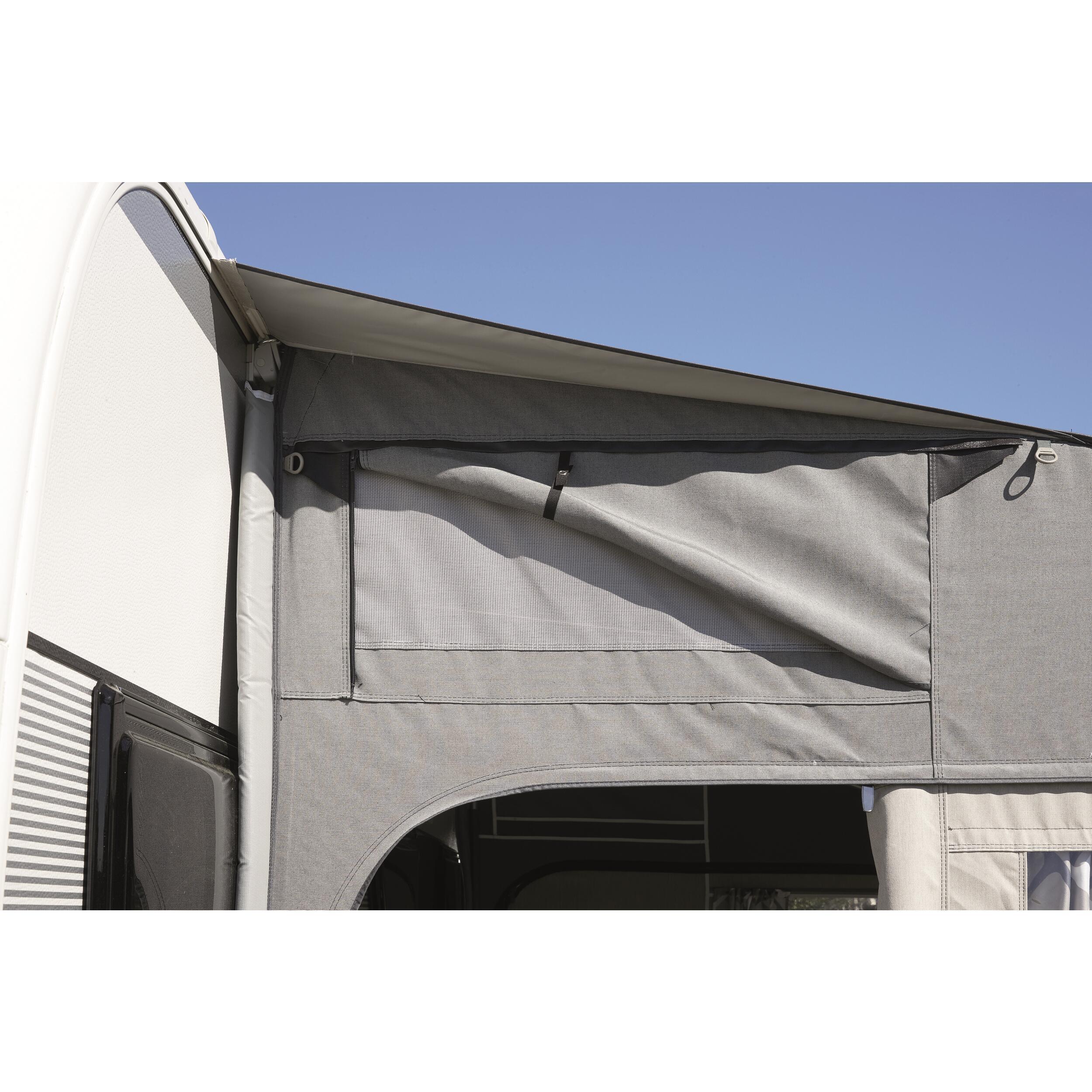 Pour une hauteur de caravane comprise entre 2,35 m et 2,50 m. Porte d'entrée des deux côtés. Façade et côtés détachables. Pour une utilisation à l'année, il est recommandé d'installer une protection d'hiver et un vélum.