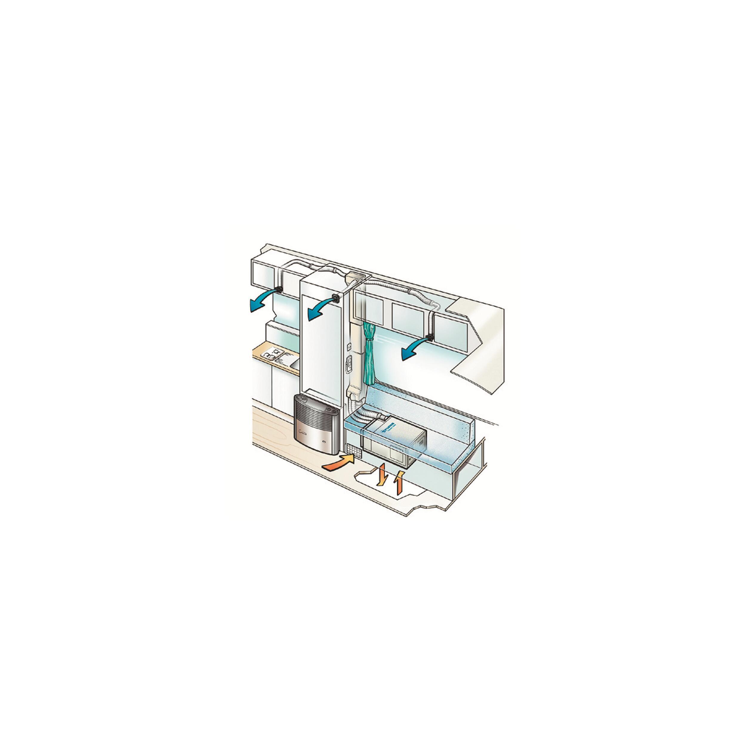 Permet de conserver le lanterneau et gagner de la place sur le toit. Possibilité de programmation jusqu'à 15 heures à l'avance. Distribution de l'air par 3 sorties. Fonction "sommeil" particulièrement silencieuse. Pour les véhicules jusqu'à 6,5 m de long.
