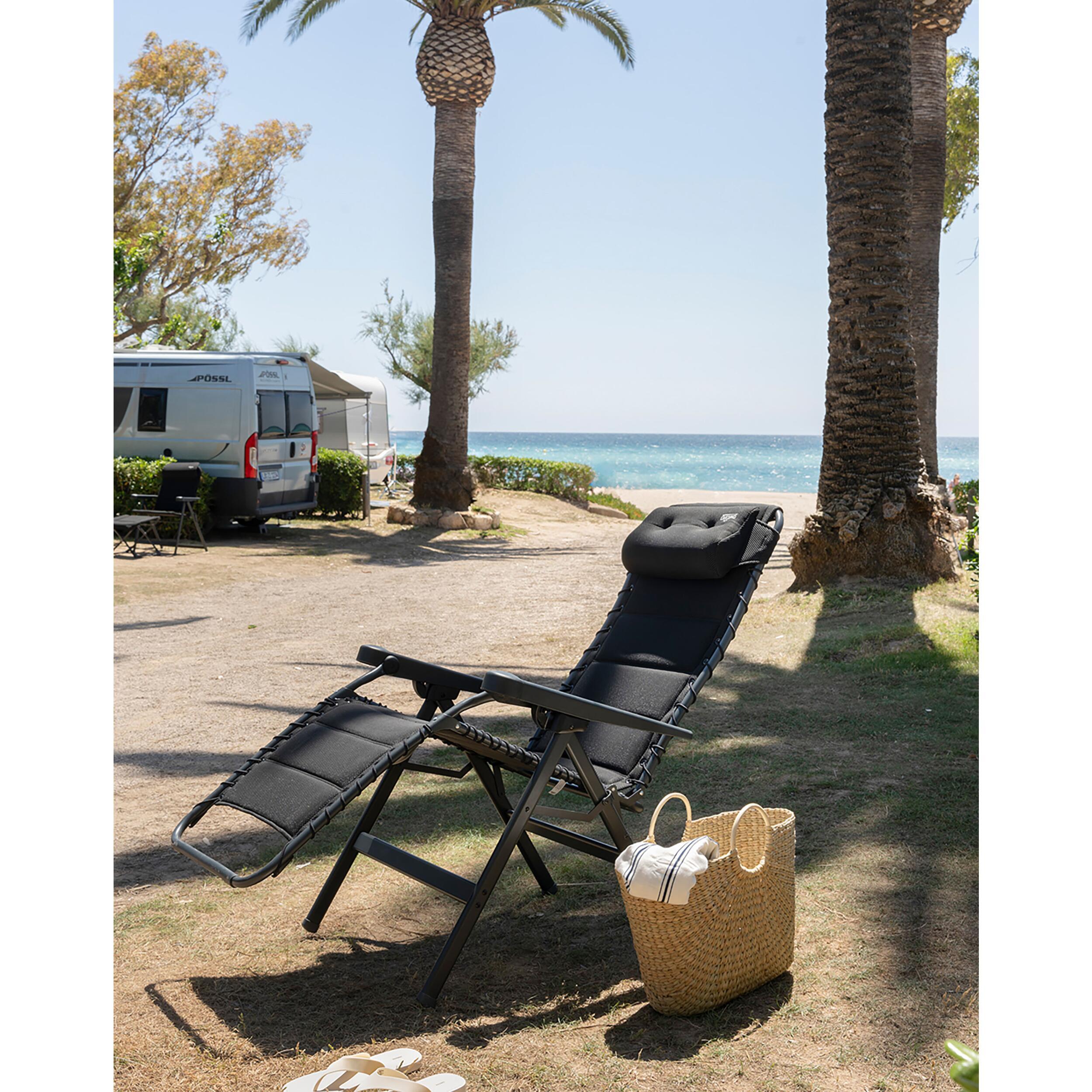 Conçu pour une relaxation totale, ce fauteuil dispose d’un repose-tête rembourré et ajustable pour un maintien parfait. Son dossier réglable en continu avec système de frein permet de bloquer la position souhaitée. Le tissu Mesh 3D Comfort Foam assure une ventilation agréable et un confort optimal, même par temps chaud. Les accoudoirs ergonomiques et la fixation élastique procurent une sensation de suspension très agréable.