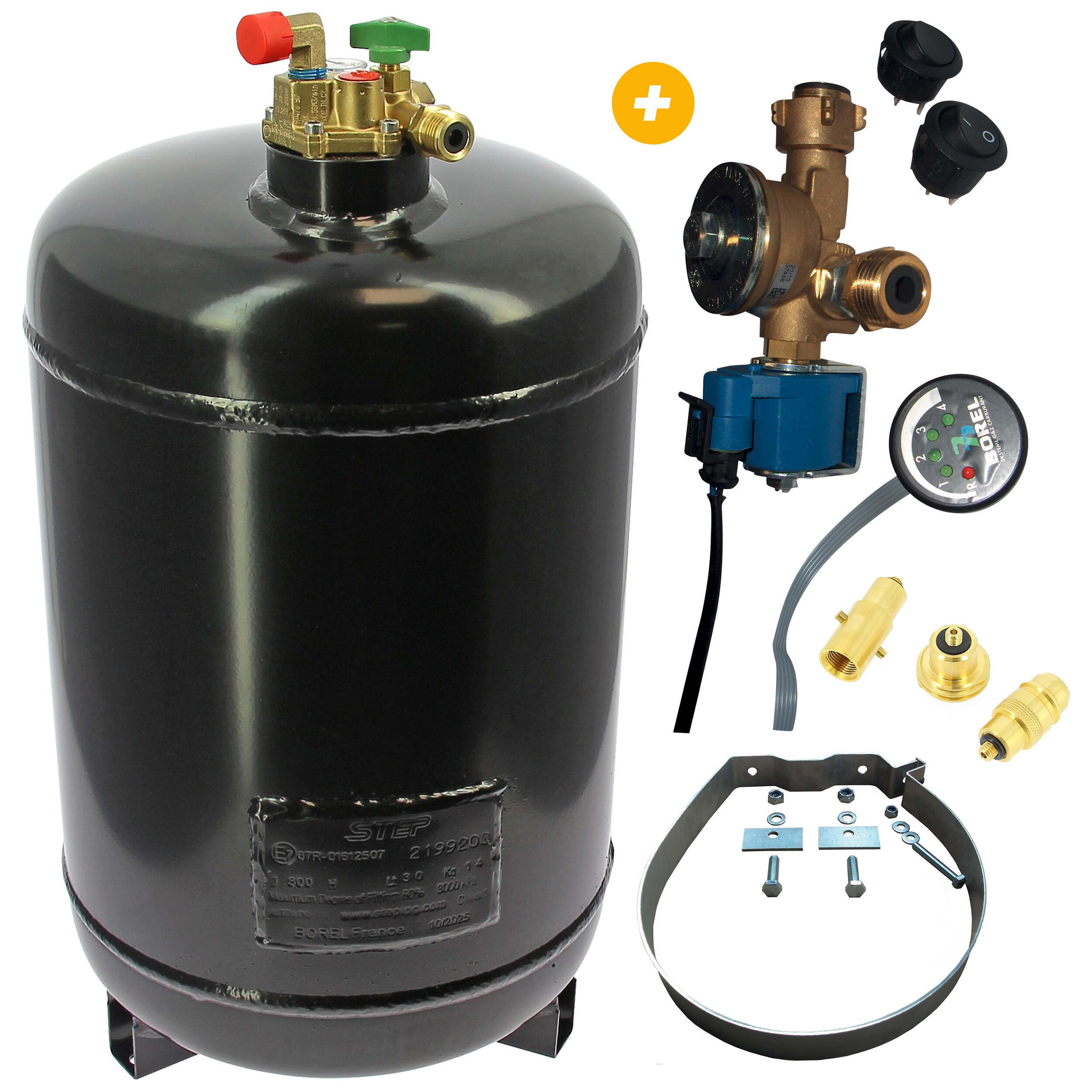 Le réservoir est équipé d’une polyvanne homologuée R67 avec limiteur de remplissage automatique à 80 %, jauge de niveau visible, soupape de sûreté haut débit et clapet anti-retour. Ce dispositif garantit une utilisation sécurisée, même en roulant, conformément à la norme EN 1949, applicable aux installations gaz dans les véhicules de loisirs.