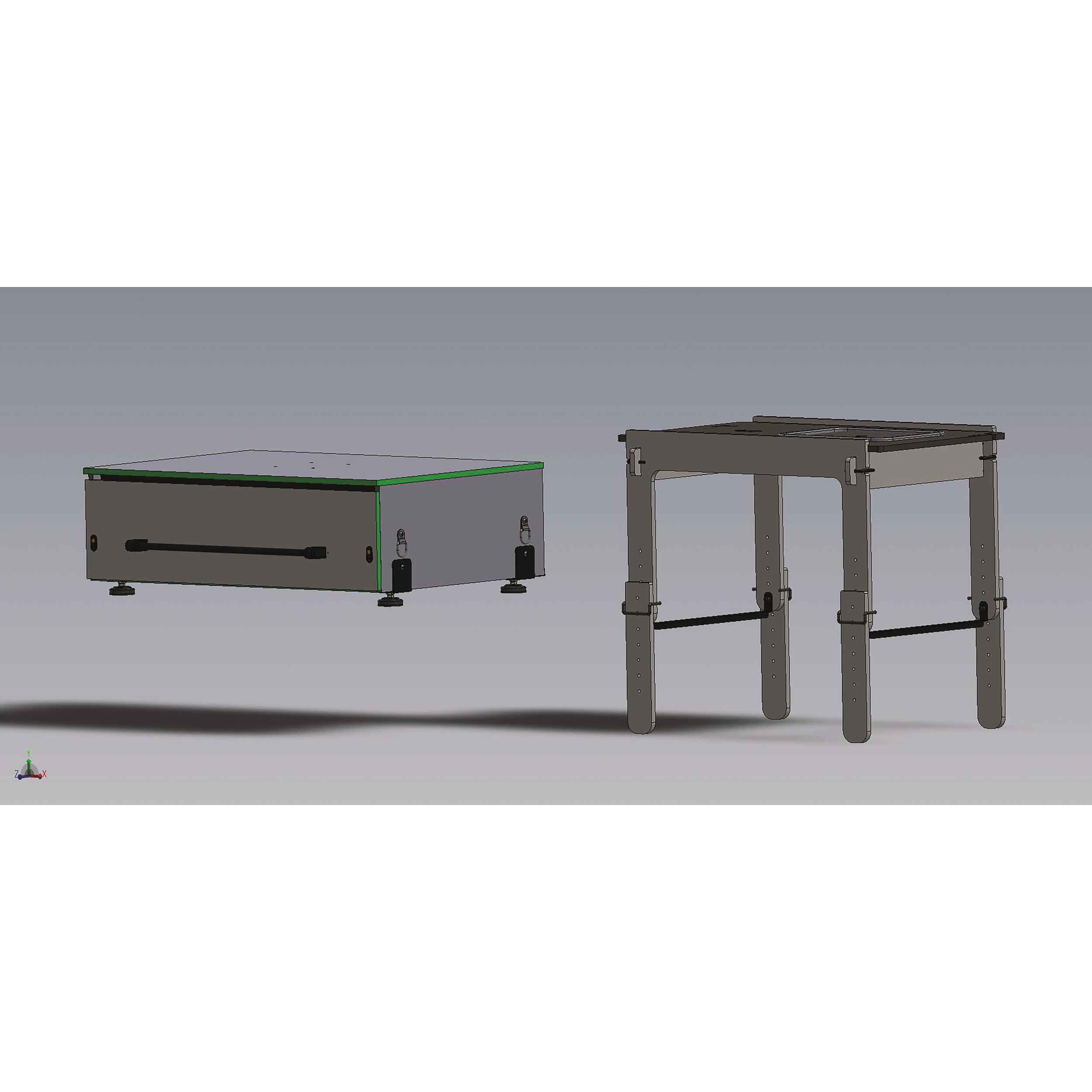 - 1 kitchenette auto portée qui s’assemble sans outils de 884 L x 500 l x 780 h mm pliée à l'intérieur du tiroir. Lorsqu’elle est montée elle dispose d’une place disponible pour accueillir un réchaud portable et une encoche sur le dessus pour recevoir une douchette*.