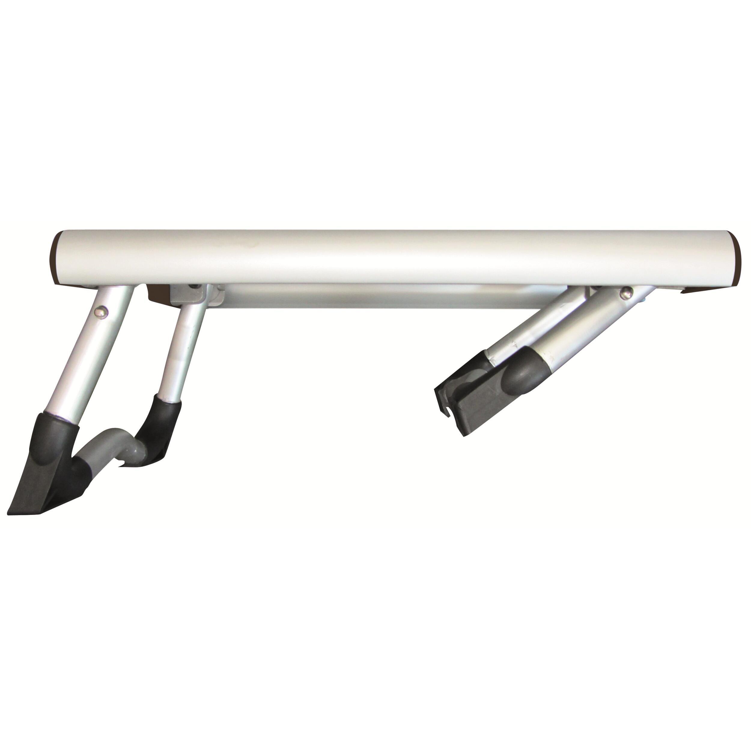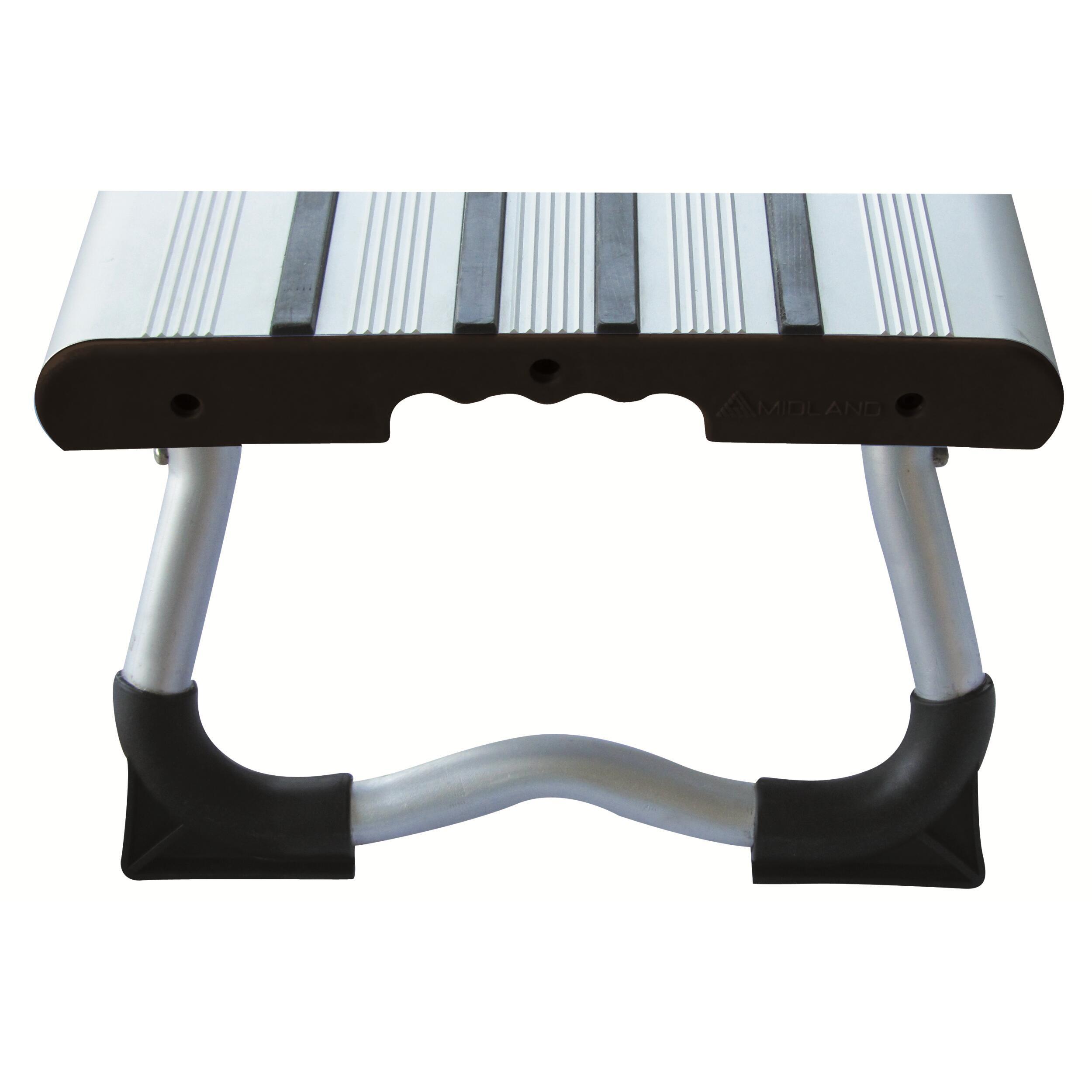 En aluminium anodisé. Blocage des pieds sécurisé en position ouvert ou fermé. Pieds intégralement repliables et anti-enfoncement. Matériaux résistant à la corrosion. Possibilité de rangement dans un support mural pendant la route (Réf. 890063). Bandes caoutchouc antidérapantes. Transport simplifié grâce aux poignées incluses sur chaque côté du marchepied.