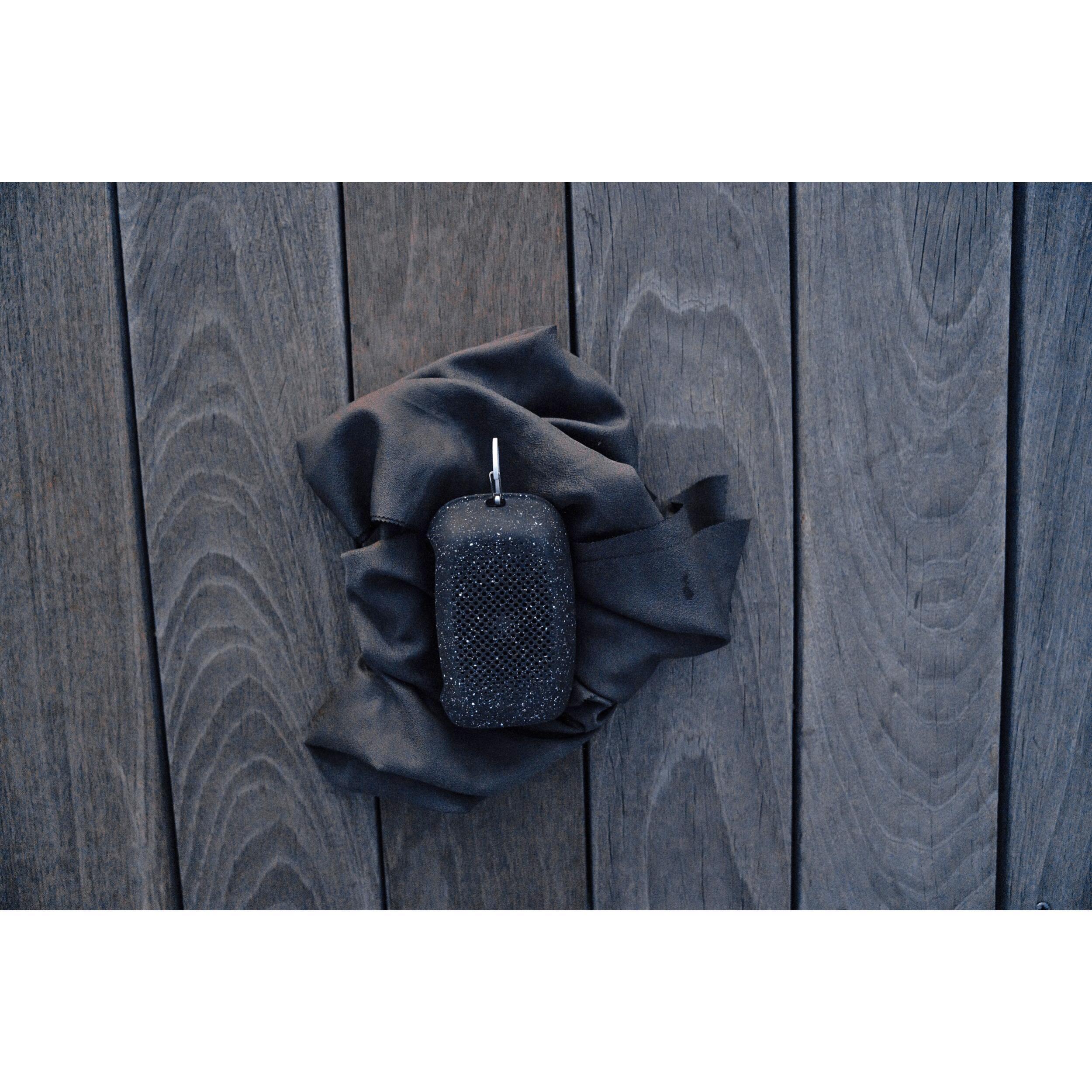 La NanoDry se distingue également par son étui de transport en silicone ventilé, équipé d’un mousqueton en aluminium anodisé. Ce système ingénieux permet non seulement de conserver la serviette séparée du reste de vos affaires, mais aussi de l’accrocher facilement à un sac à dos, une poignée ou un porte-serviette, même lorsqu’elle est encore humide.