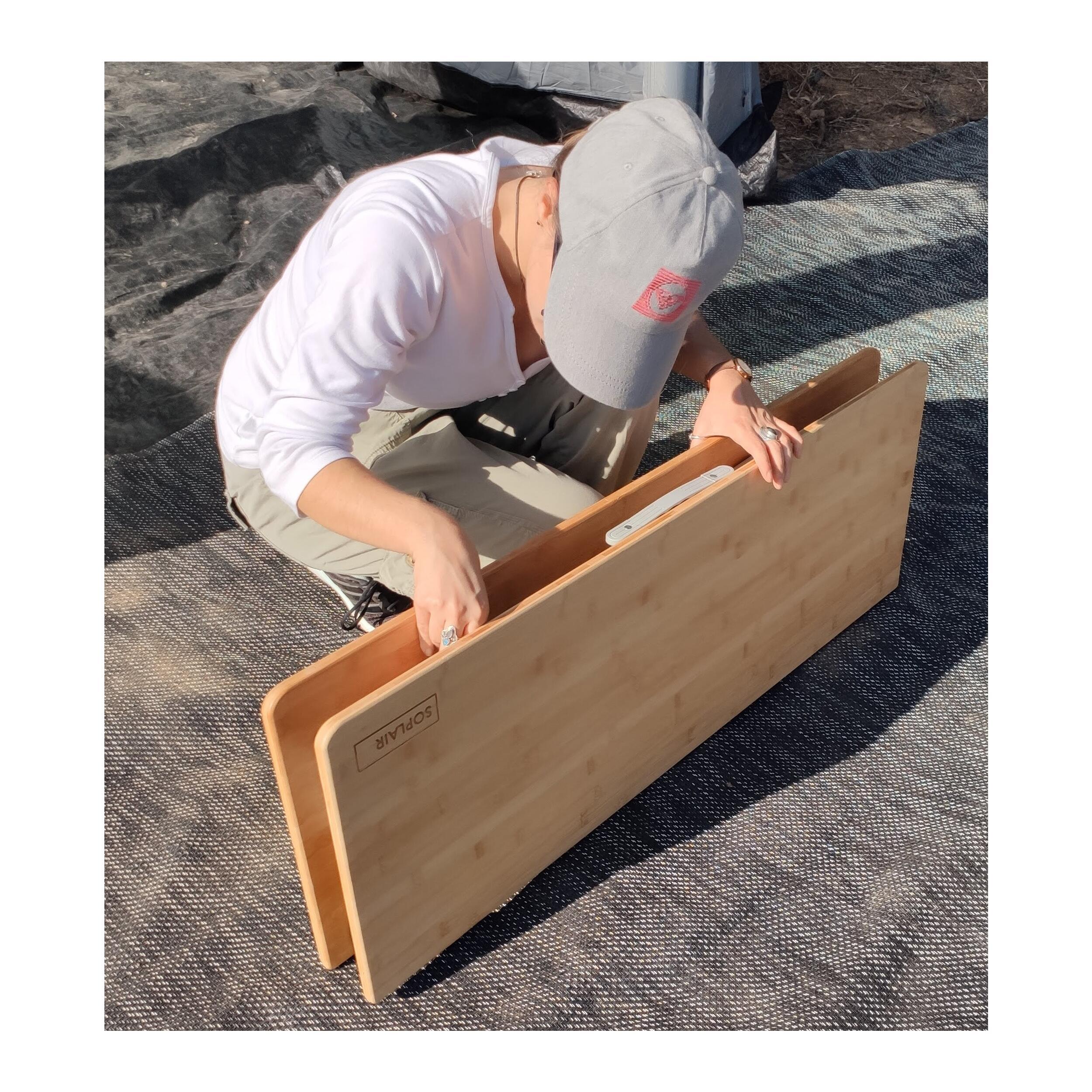 La table de la marque Soplair, dont le système de pliage est en deux parties, possède un plateau pliant et des pieds repliables sous le plateau. Par conséquent, elle peut se ranger facilement dans son sac de transport en tissu Oxford 600D. Il devient alors très simple de voyager avec la table Bambou valise stockée dans votre camping-car, fourgon ou autres véhicules de loisirs.