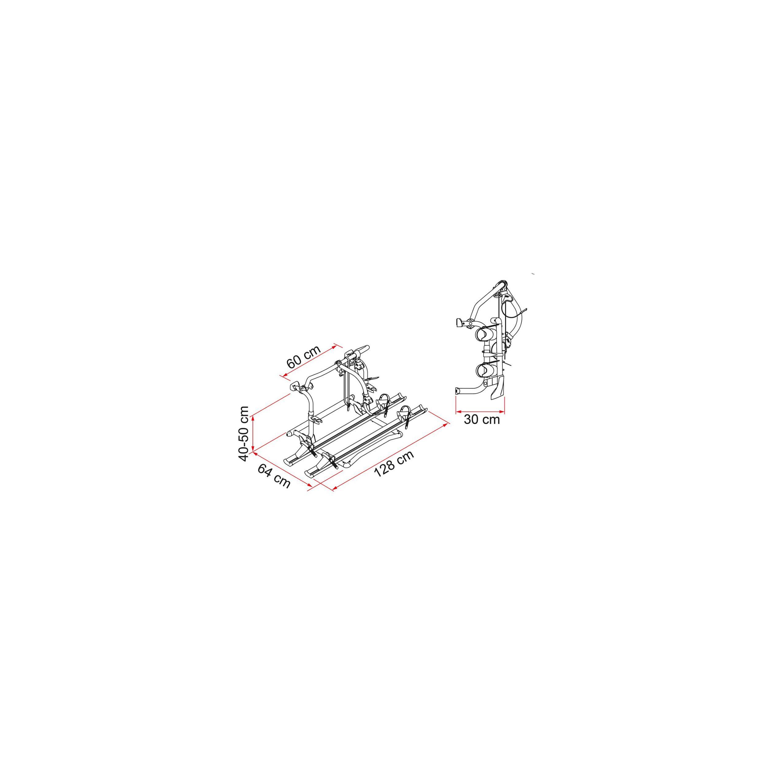 Modèle universel, léger et solide. Structure télescopique réglable en hauteur de 80 à 150 cm. Fixation directe sur la paroi arrière du camping-car. Capacité : 2 vélos de série, extensible à 3 vélos.