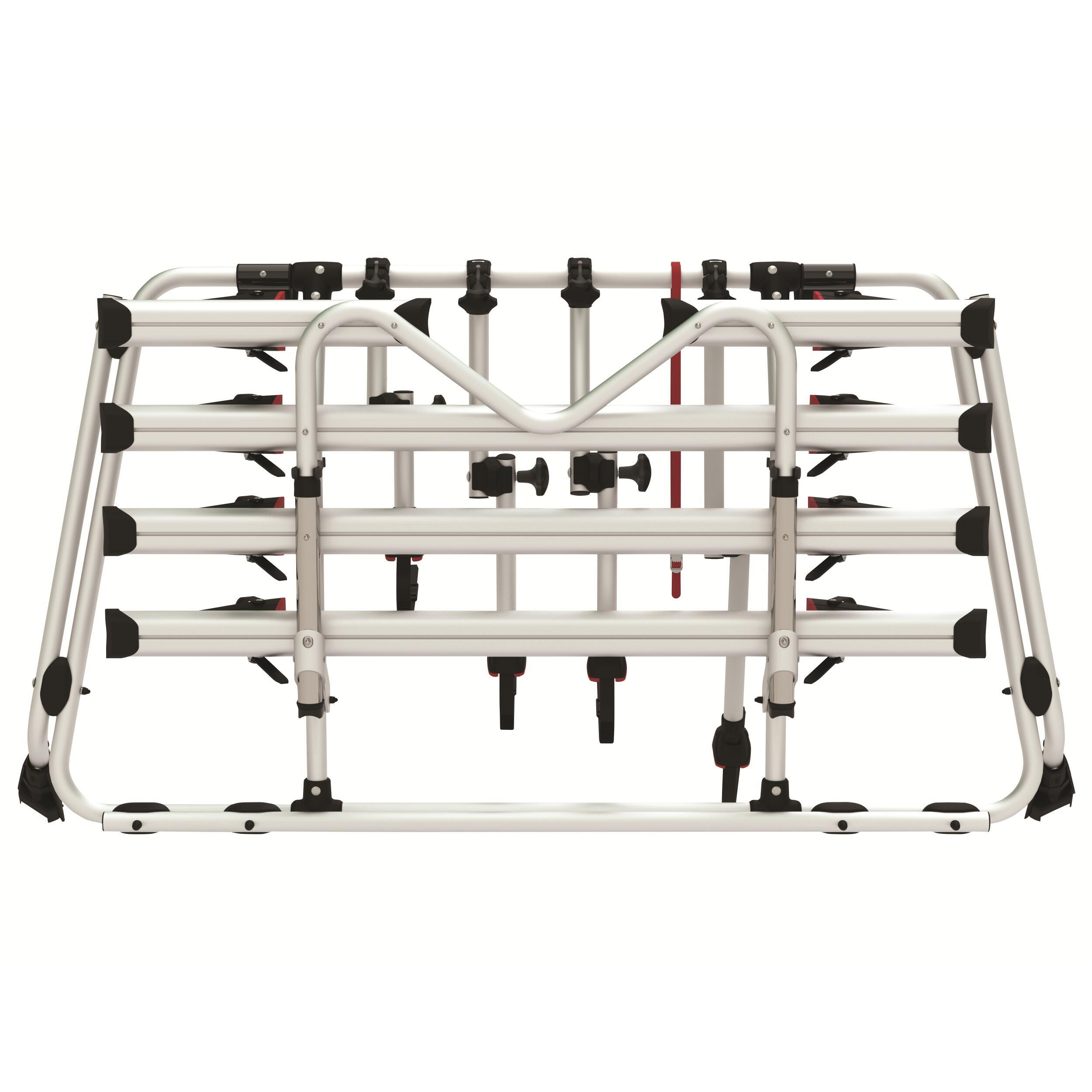 Le Carry-Bike permet de transporter 2 vélos (ou plus selon les modèles) avec un maintien optimal. Les vélos sont fixés à l’aide de rails en aluminium solides, de bras de maintien réglables et d’une sangle de sécurité Fiamma Security Strip fournie de série, pour une parfaite tenue sur route, même en cas de freinage brusque ou de virage serré.