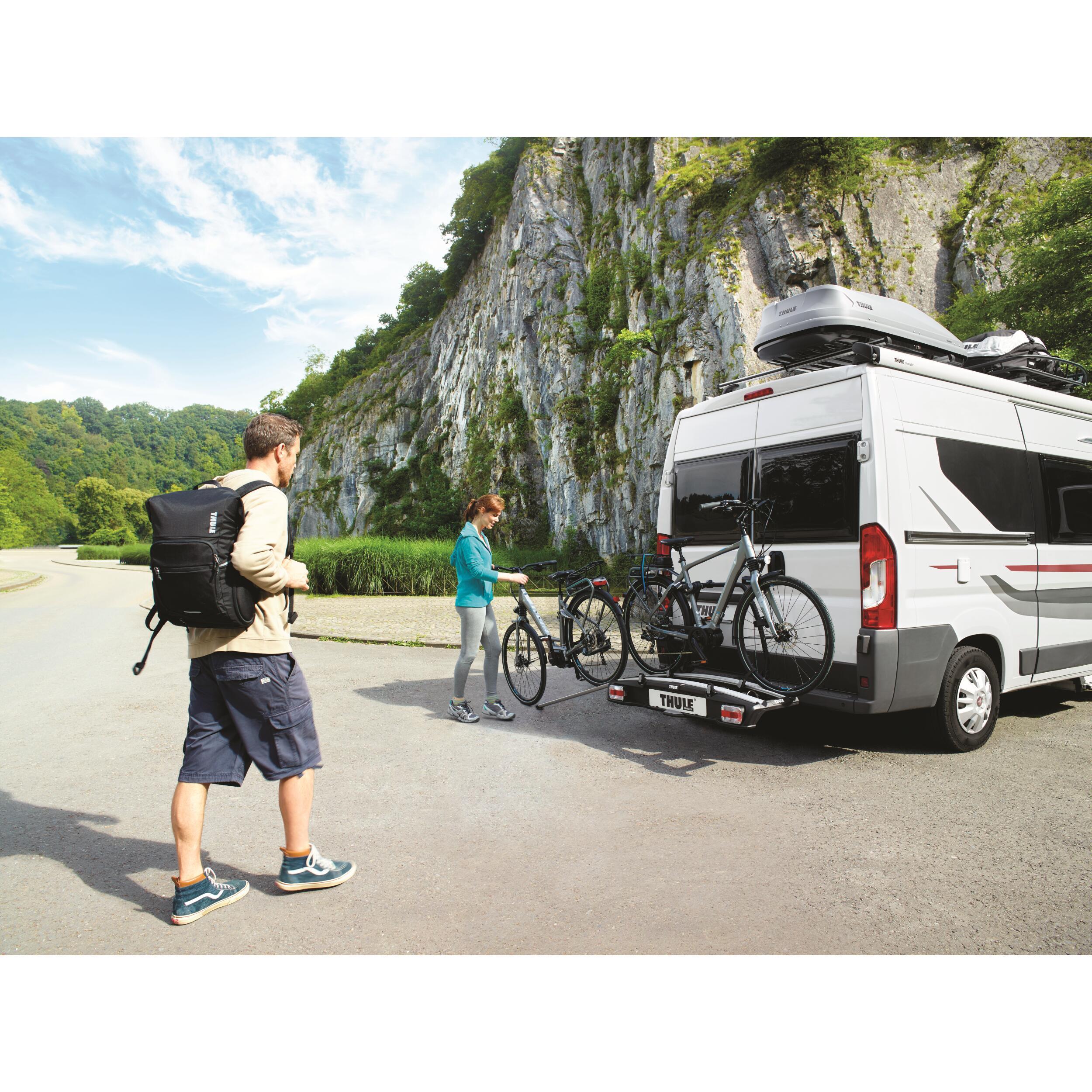 Le Thule VeloSpace XT 13PIN est un porte-vélos sur boule d'attelage, offrant un accès facile au coffre même avec les vélos fixés et se rangeant facilement lorsqu'il n'est pas utilisé.