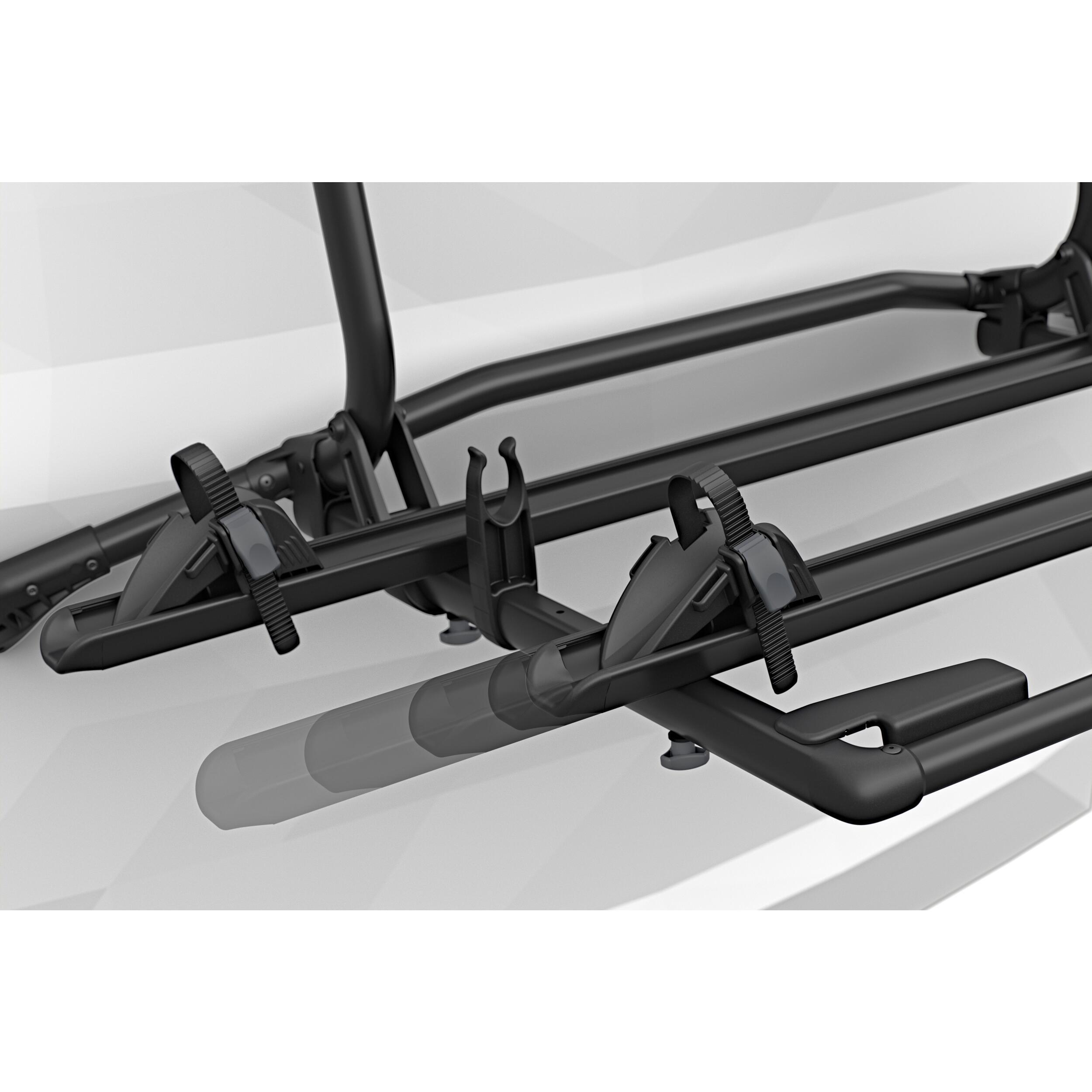 Le Thule WanderWay Black est positionné en hauteur, garantissant une visibilité optimale des feux arrière et de la plaque d’immatriculation, même avec les vélos en place. Il est compatible avec les cadres en carbone (avec adaptateur Thule Carbon Frame Protector en option) et peut accueillir des pneus jusqu’à 2,75” de largeur, un diamètre de roue jusqu’à 29”, et un empattement maximum de 1270 mm.