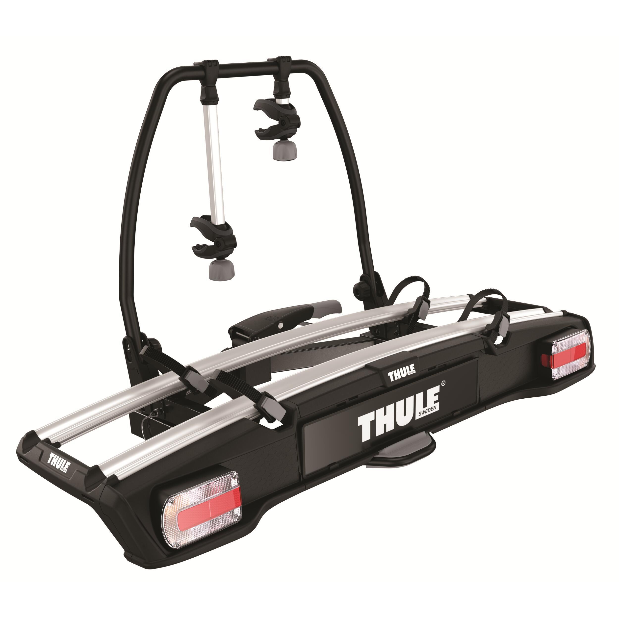 Le Thule VeloSpace XT 13PIN est un porte-vélos sur boule d'attelage, offrant un accès facile au coffre même avec les vélos fixés et se rangeant facilement lorsqu'il n'est pas utilisé.