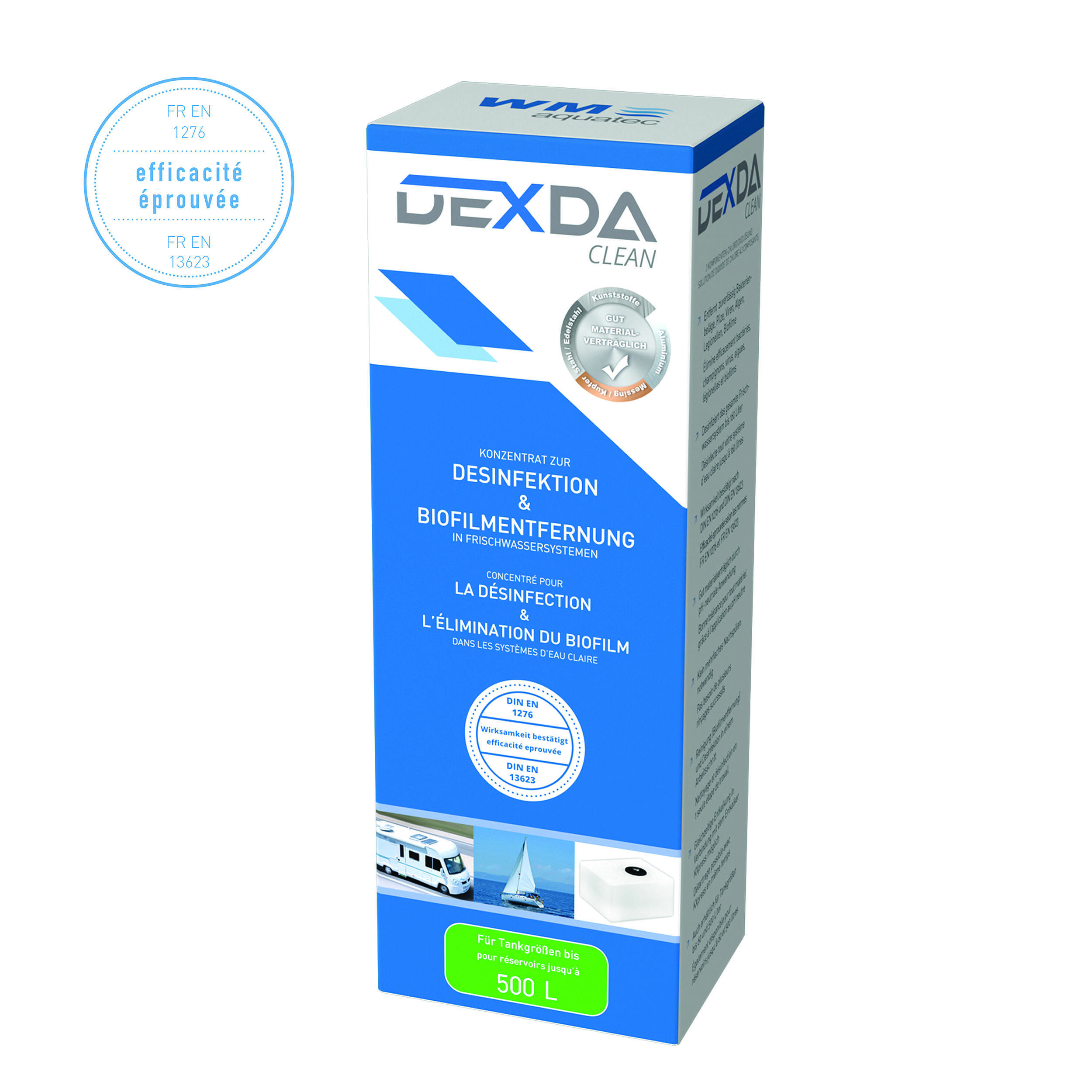 Avec DEXDA Clean, vous éliminerez efficacement les bactéries, les champignons, les virus, les algues, les légionelles ainsi que les bio-films. Il nettoie et désinfecte le système entier d’eau claire et élimine les odeurs désagréables. Pas besoin de plusieurs rinçages successifs. Grâce à sa composition en dioxyde de chlore, il est 25 fois plus fort que l‘oxygène actif. A utiliser idéalement en début et en fin de saison. Il peut s’utiliser en même temps que le KXpress d’Aquatec si vous souhaitez désinfecter et détartrer en une seule application. Disponible en 3 versions.