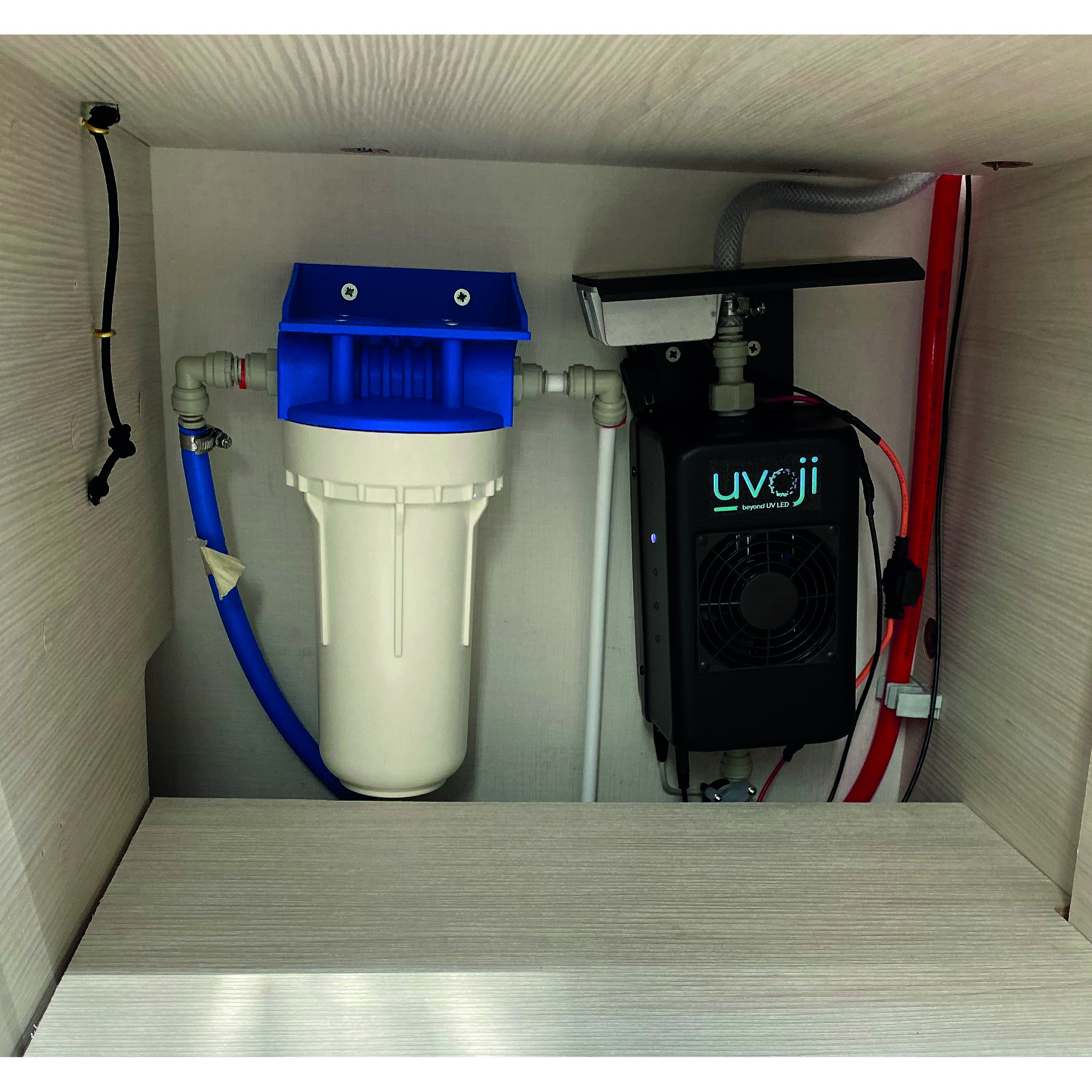 Le Pack Oji Pure d’Uvoji purifie instantanément l’eau de votre camping-car grâce à la technologie LED UV-C et une filtration au charbon actif 2 en 1, pour une eau saine, sans goût ni odeur, prête à la consommation.