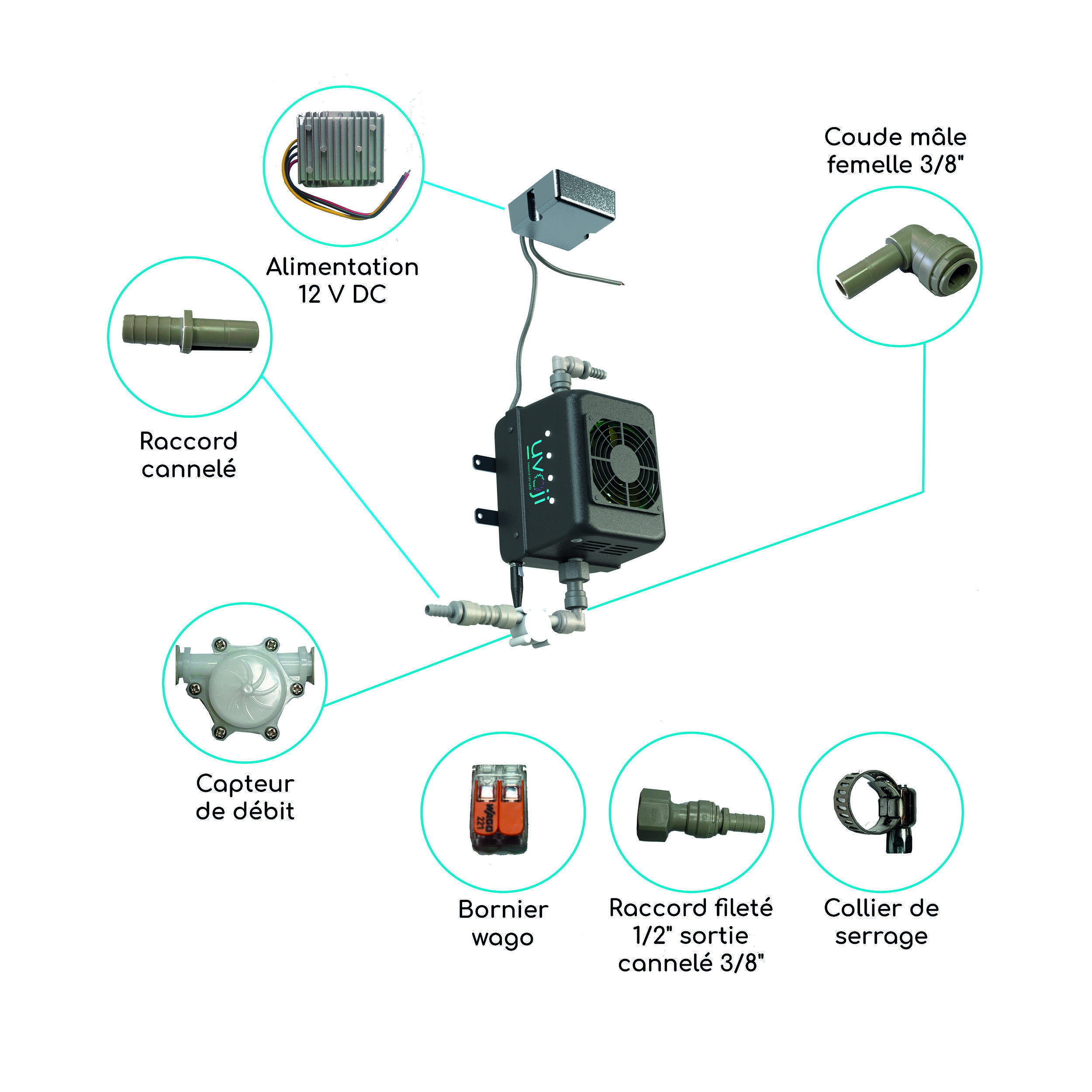 Avec ses dimensions compactes (160 x 119 x 111 mm) et son poids plume d’1 kg, le purificateur Oji Camp se glisse facilement sous un évier, dans un meuble de cuisine ou un coffre technique. Les raccords cannelés de 10 ou 12 mm s’adaptent à la plupart des tuyaux utilisés dans les camping-cars et vans, sans nécessiter d’outillage spécifique. Une fois en place, il ne prend pas de place et reste accessible pour un éventuel entretien. Son alimentation en 12 V le rend compatible avec les batteries de votre véhicule, sans risque de surcharge, et sa consommation de 25 W en fonctionnement reste modeste, même lors des longues étapes.