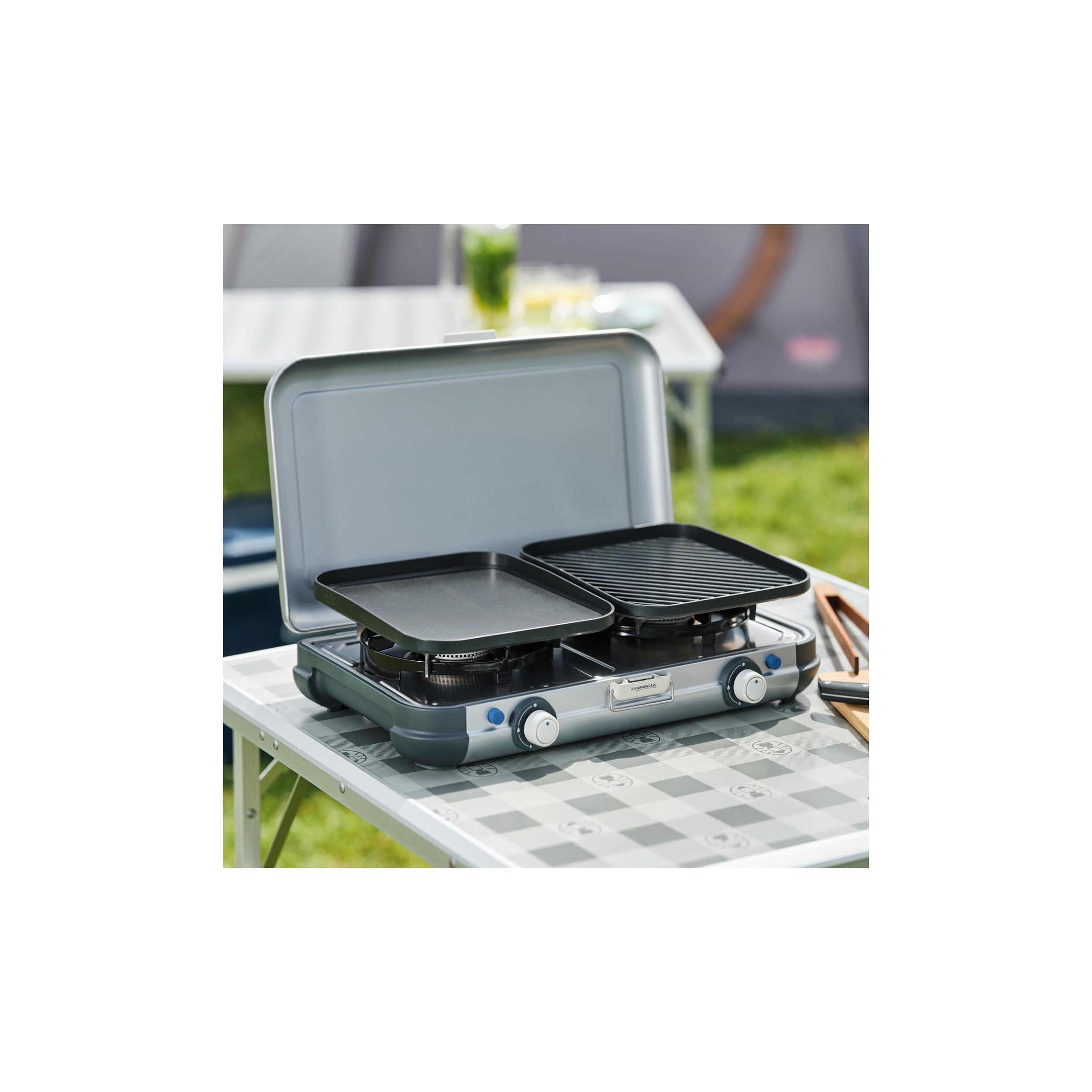 Le Camping Kitchen 2 Grill & Go R est un réchaud 2 feux polyvalent, avec grill, plancha et supports de casseroles interchangeables. Compact et transportable, il fonctionne sur bouteille de gaz.