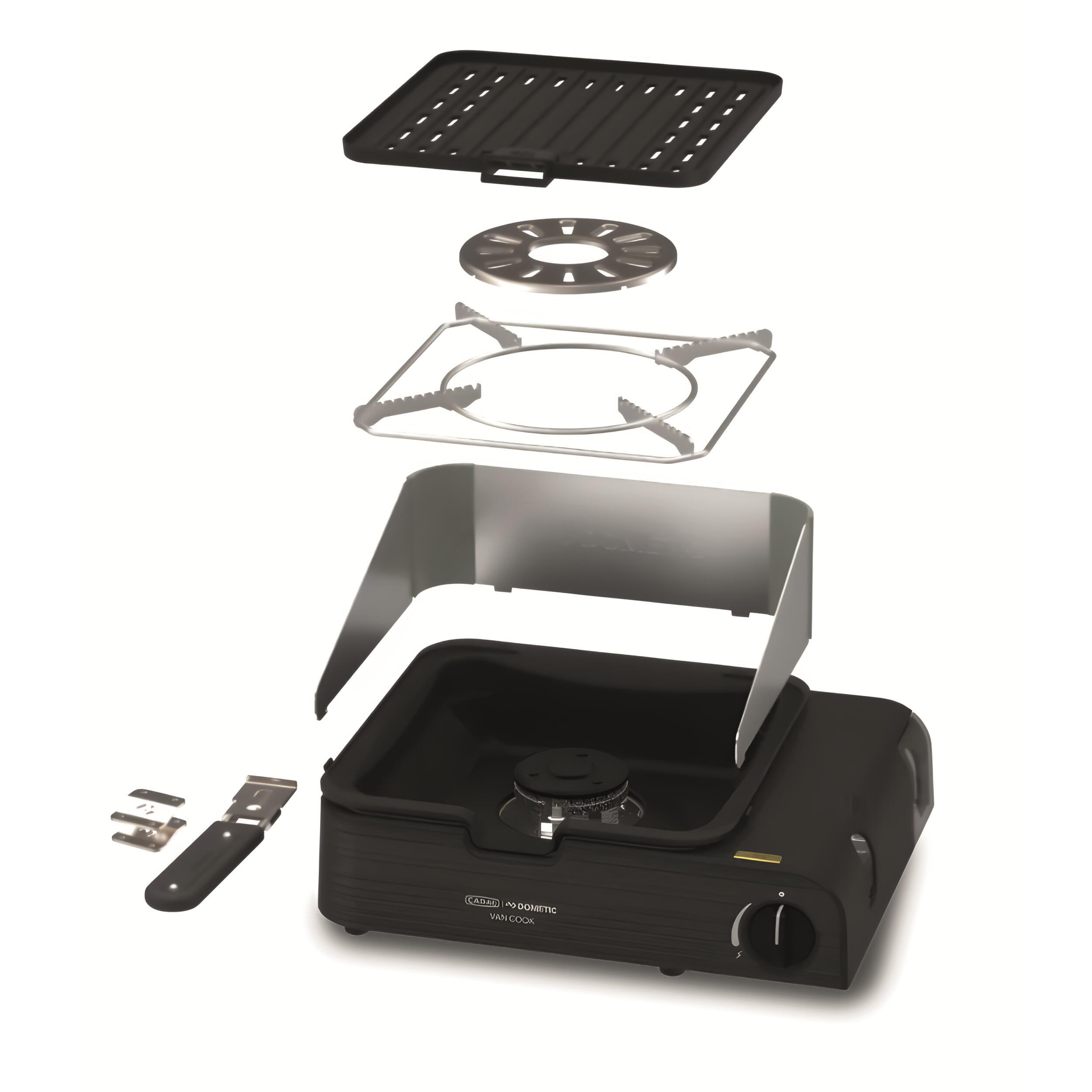 Comprend : un support pour casserole, une plaque de barbecue, une poignée amovible, un support pour cafetière, une protection anti-éclaboussures et un sac de transport.