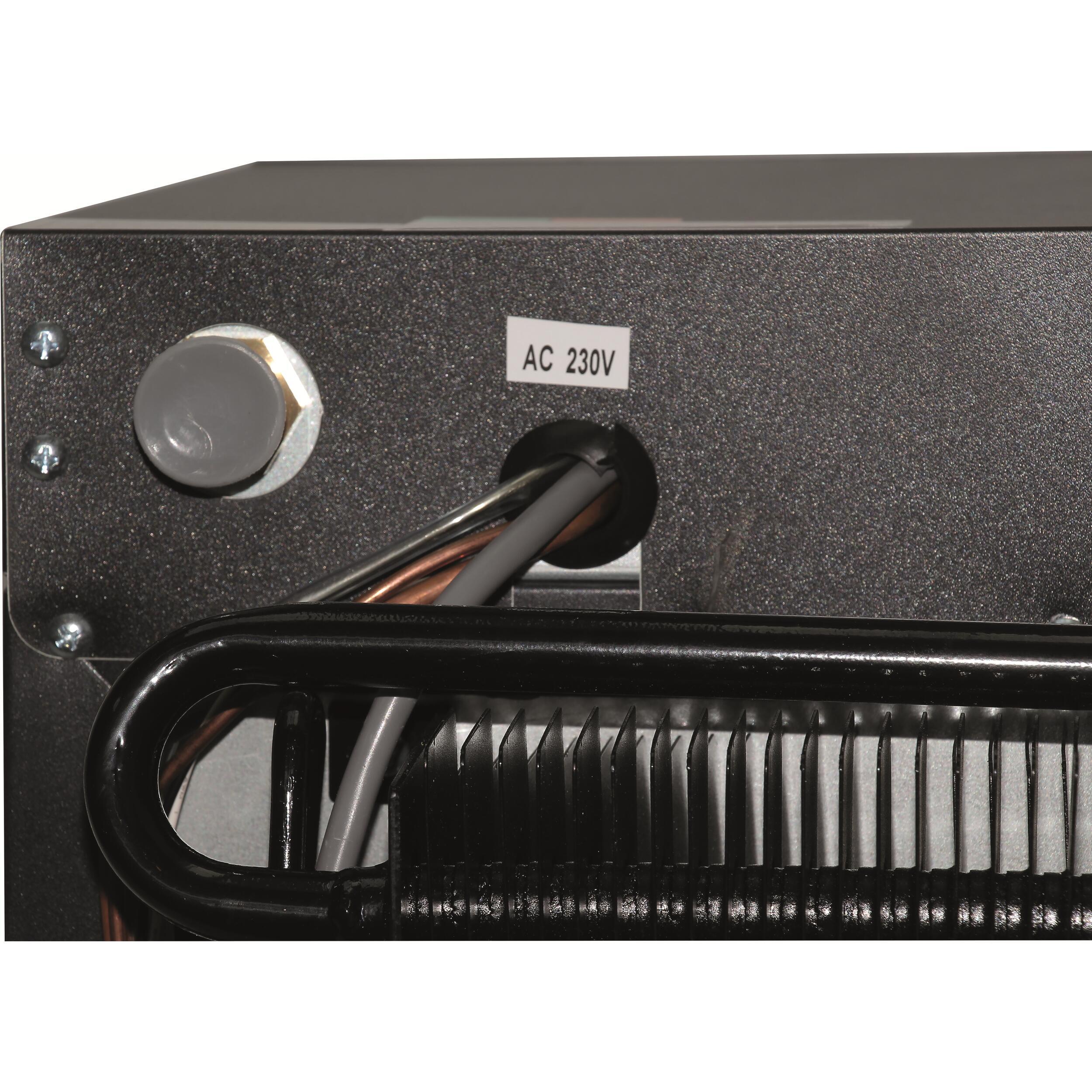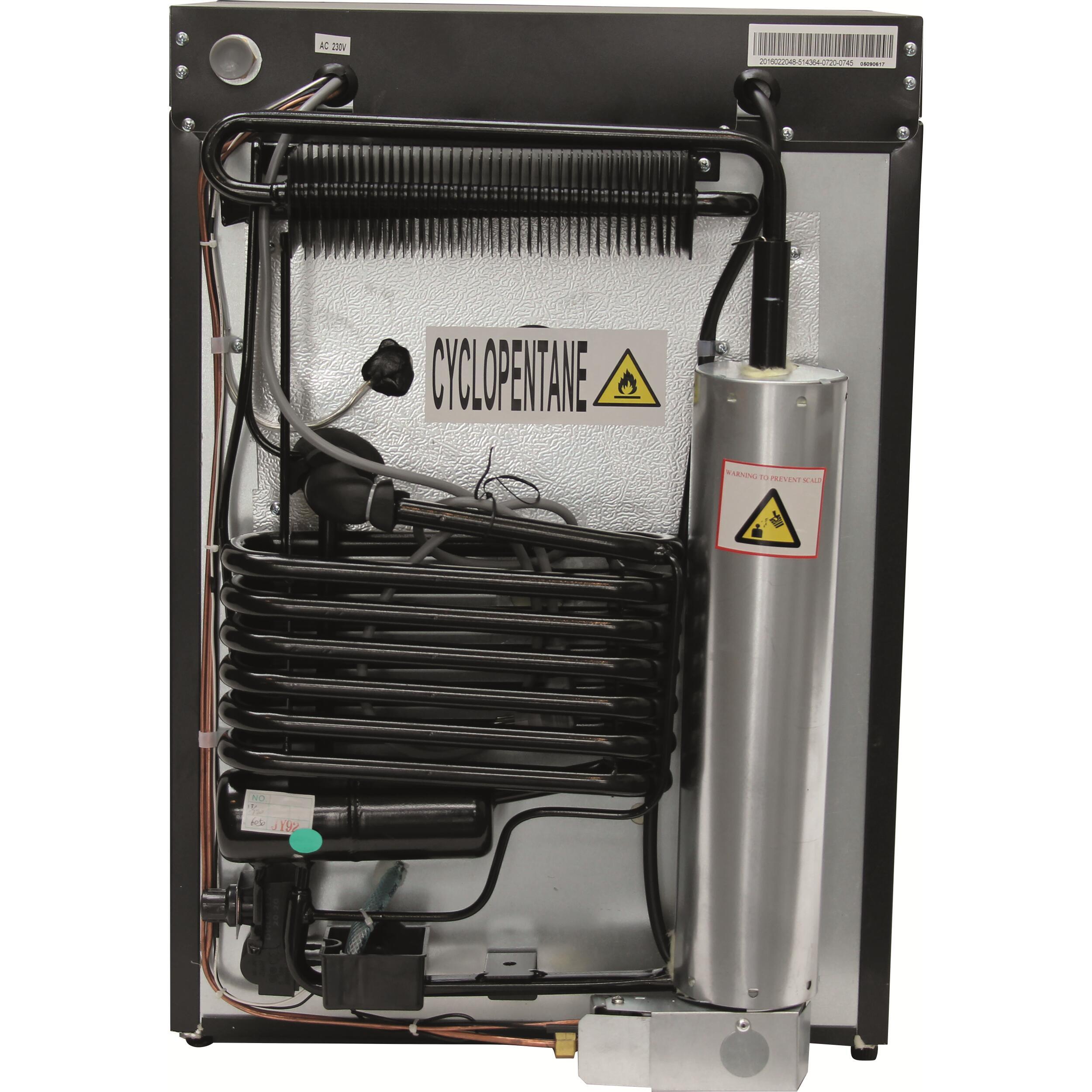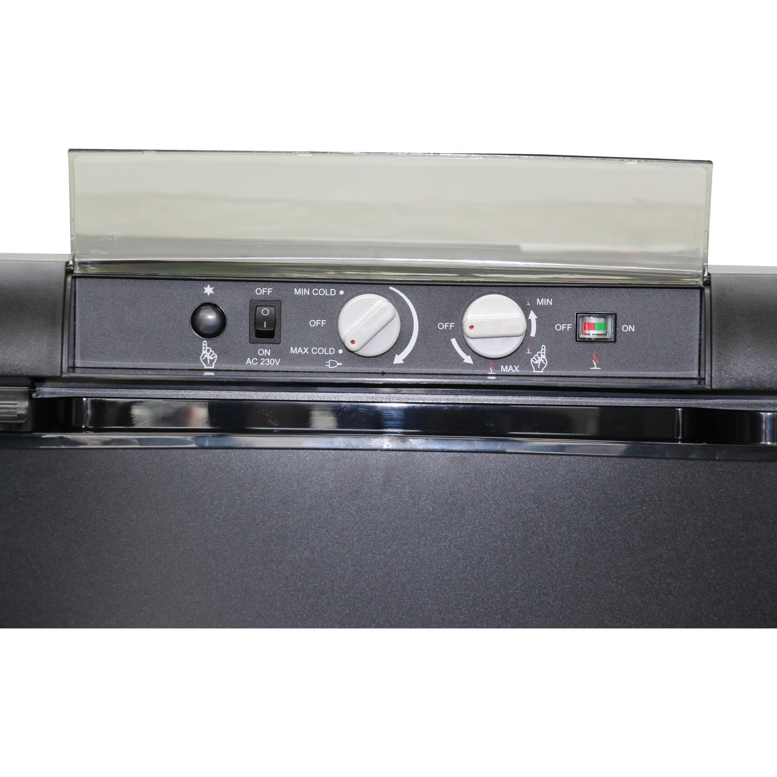 Le modèle de 60L propose une capacité intérieure de 46L, avec deux grilles et deux étagères de porte. Ses clayettes sont réglables sur six positions et il consomme 90W.