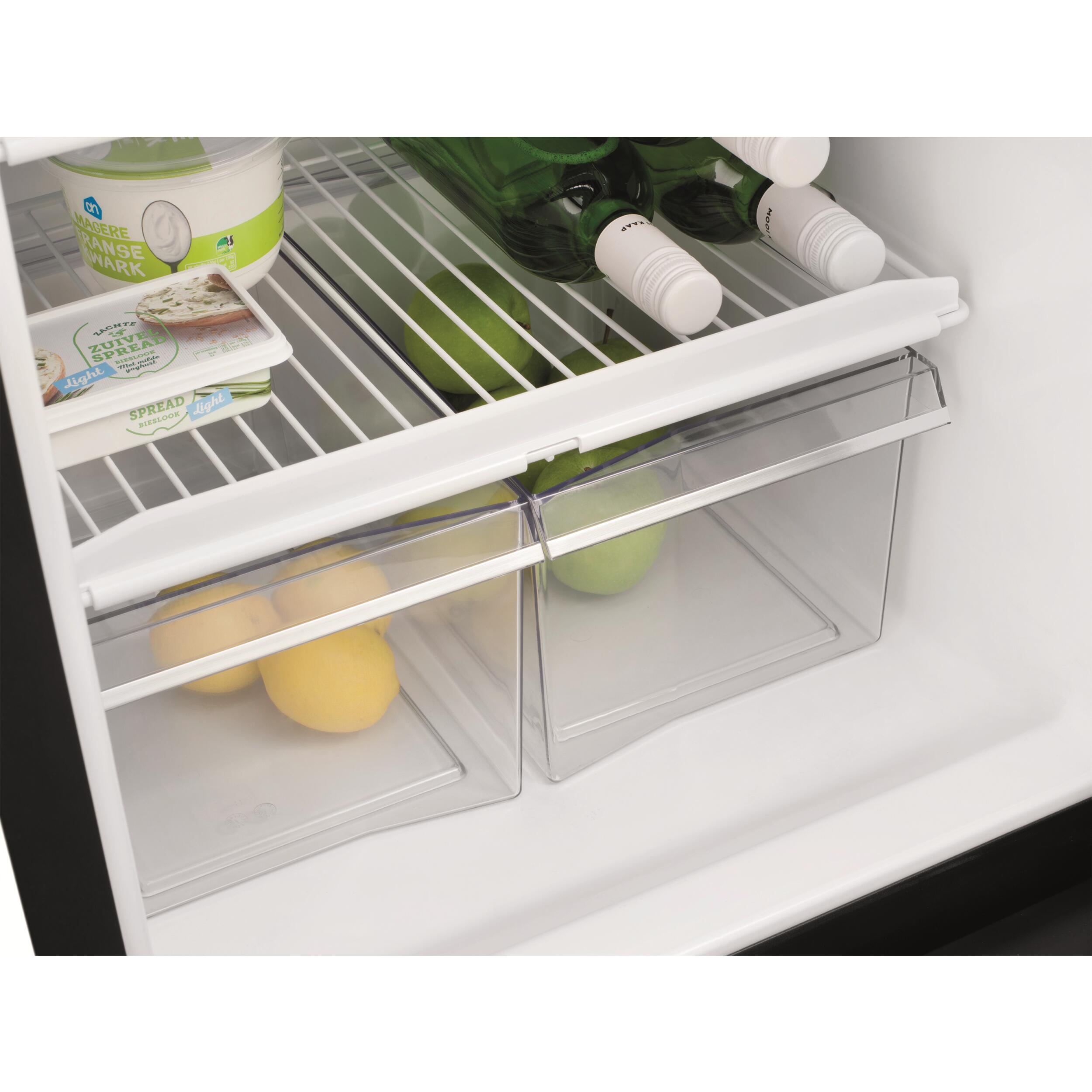 L'intérieur est optimisé avec plusieurs zones de rangement : des clayettes ajustables, un tiroir à bouteilles coulissant, des bacs de porte modulables et un grand tiroir pour le compartiment freezer (selon modèle). Le design intérieur moderne facilite l'organisation et l'accès aux aliments.