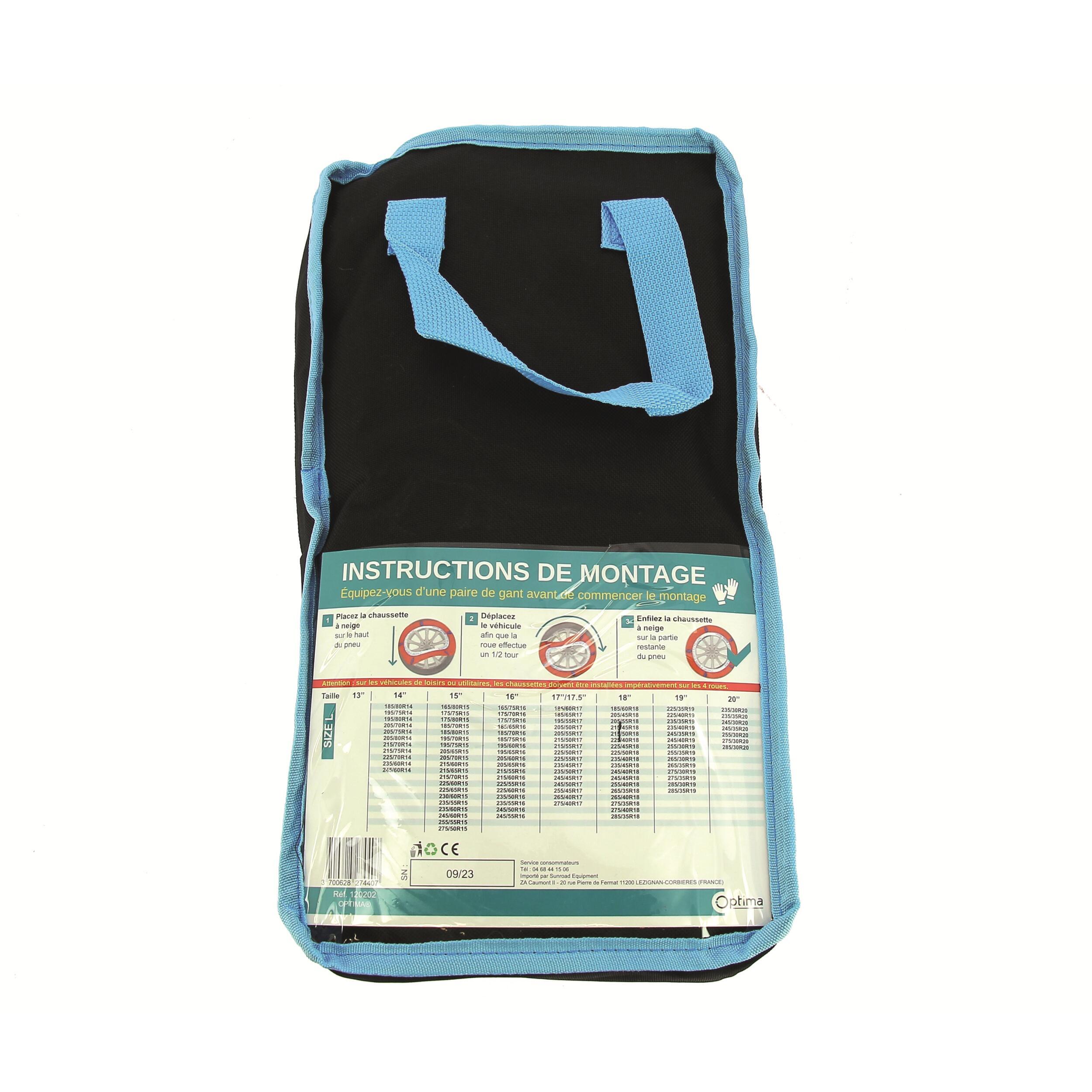 Le choix de la taille appropriée conditionne l'efficacité et la sécurité de votre équipement hivernal. La paire de chaussettes à neige Optima se décline en deux modèles parfaitement adaptés aux différentes dimensions de pneumatiques équipant les camping-cars.