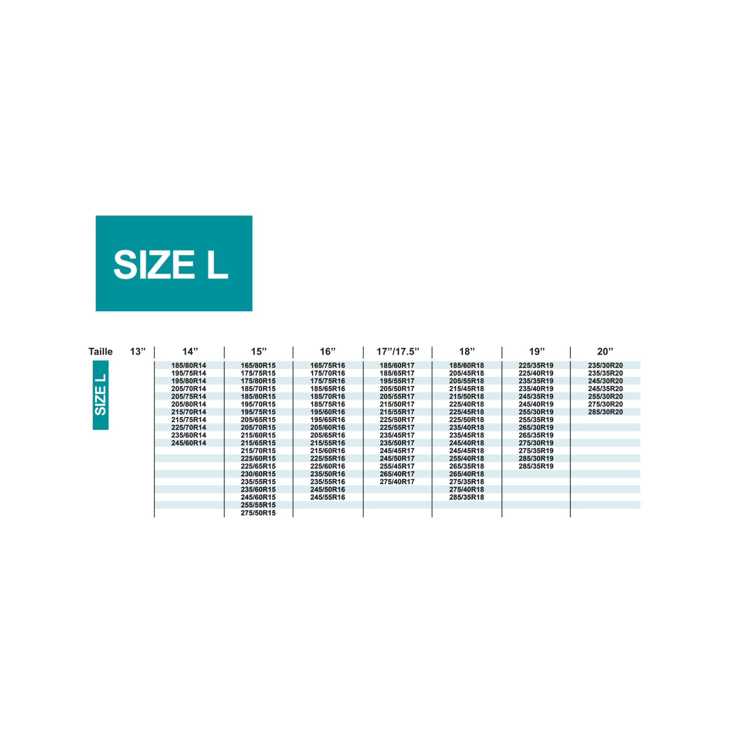 La paire de chaussettes à neige Optima taille L convient parfaitement aux camping-cars équipés de pneumatiques de dimensions moyennes. Cette taille est compatible avec les dimensions suivantes : 205/70R15, 215/70R15, 185/75R16, 195/65R16, 195/60R16, 205/60R16, 215/60R16, 215/55R16, 225/55R16, 205/55R17, 215/55R17, 205/50R17, 215/50R17, 225/50R17, 235/45R17, 225/45R18, 225/40R18. Cette gamme étendue de compatibilités couvre la majorité des camping-cars de gabarit standard présents sur le marché.