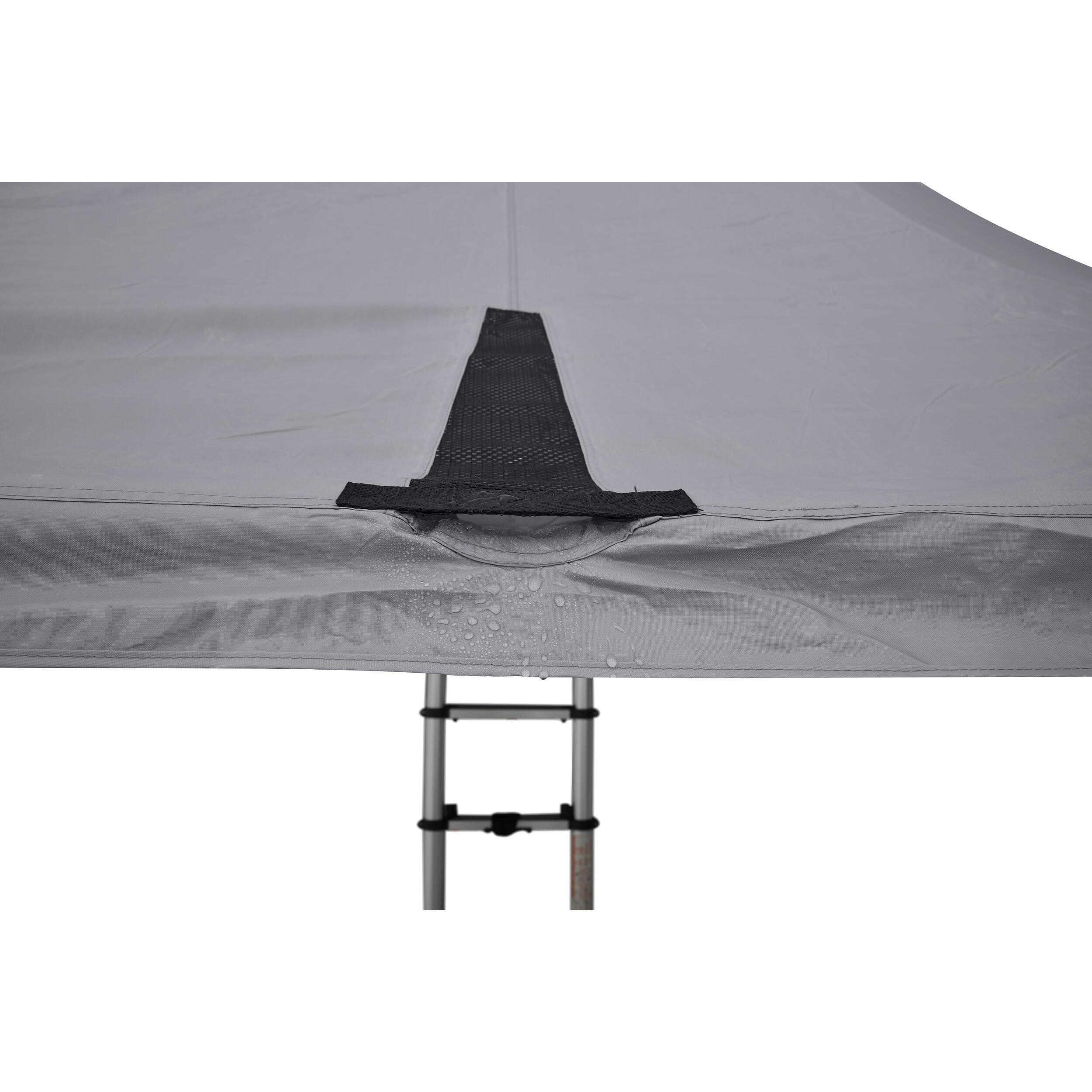 L’auvent se fixe à la tente de toit grâce à un système de zip. Les poteaux en aluminium sont ajustables en hauteur, ce qui facilite la mise en place selon vos besoins.