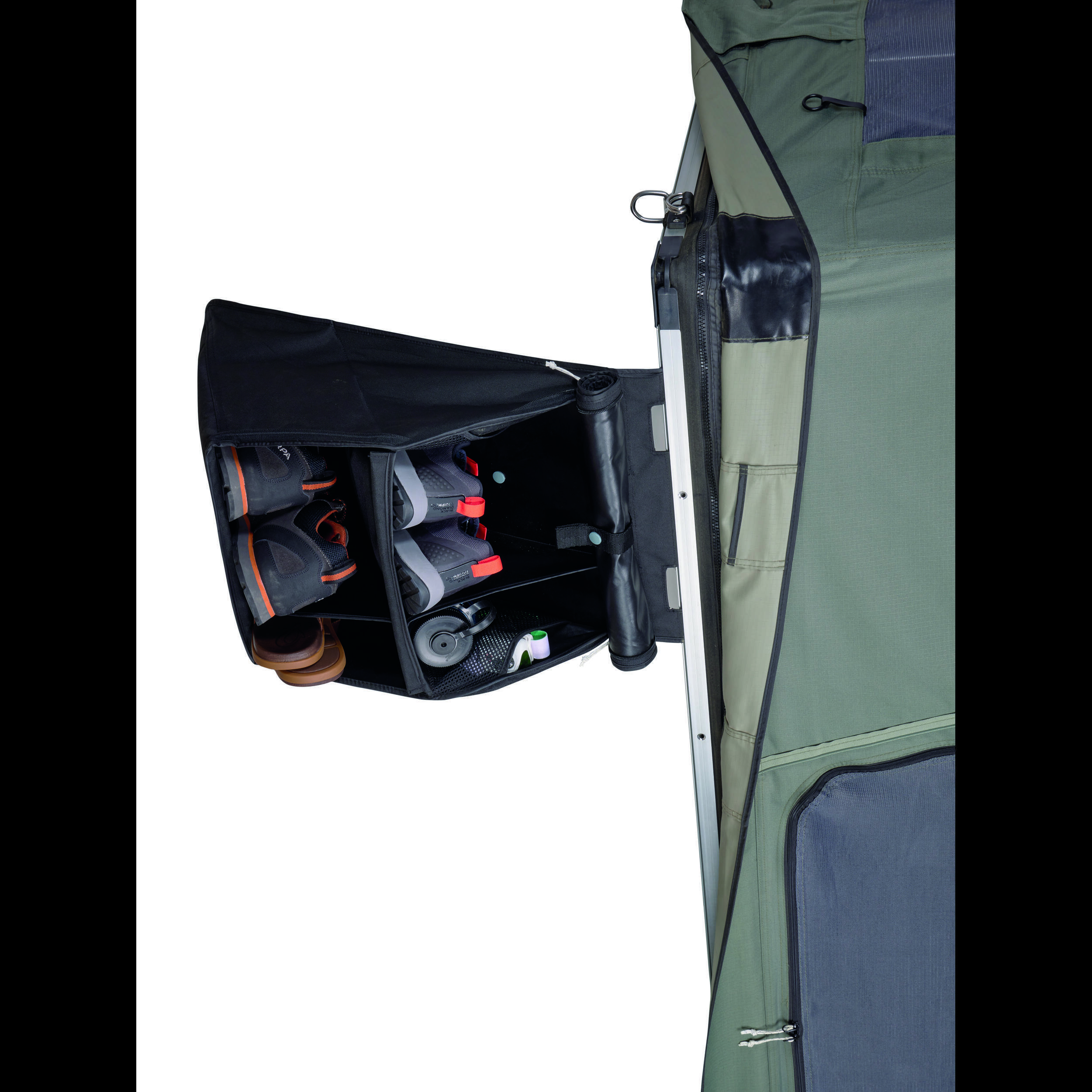Organiseur Thule pour tente de toit : optimisez le rangement de vos chaussures et accessoires avec ses compartiments variés, tissu étanche et design compact.