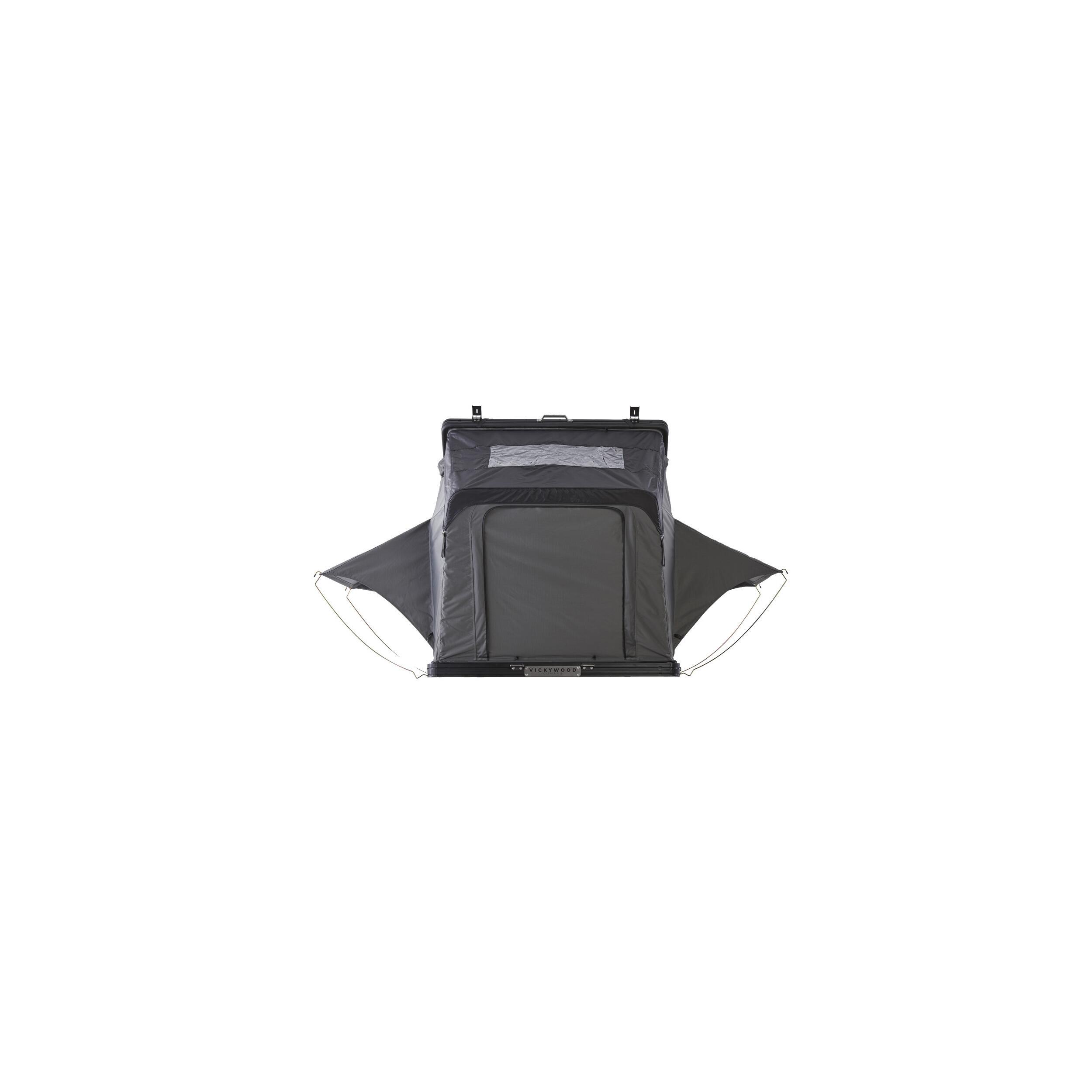 Il suffit de desserrer les deux boucles et grâce au système de vérins, la tente de toit s’ouvre pratiquement toute seule.