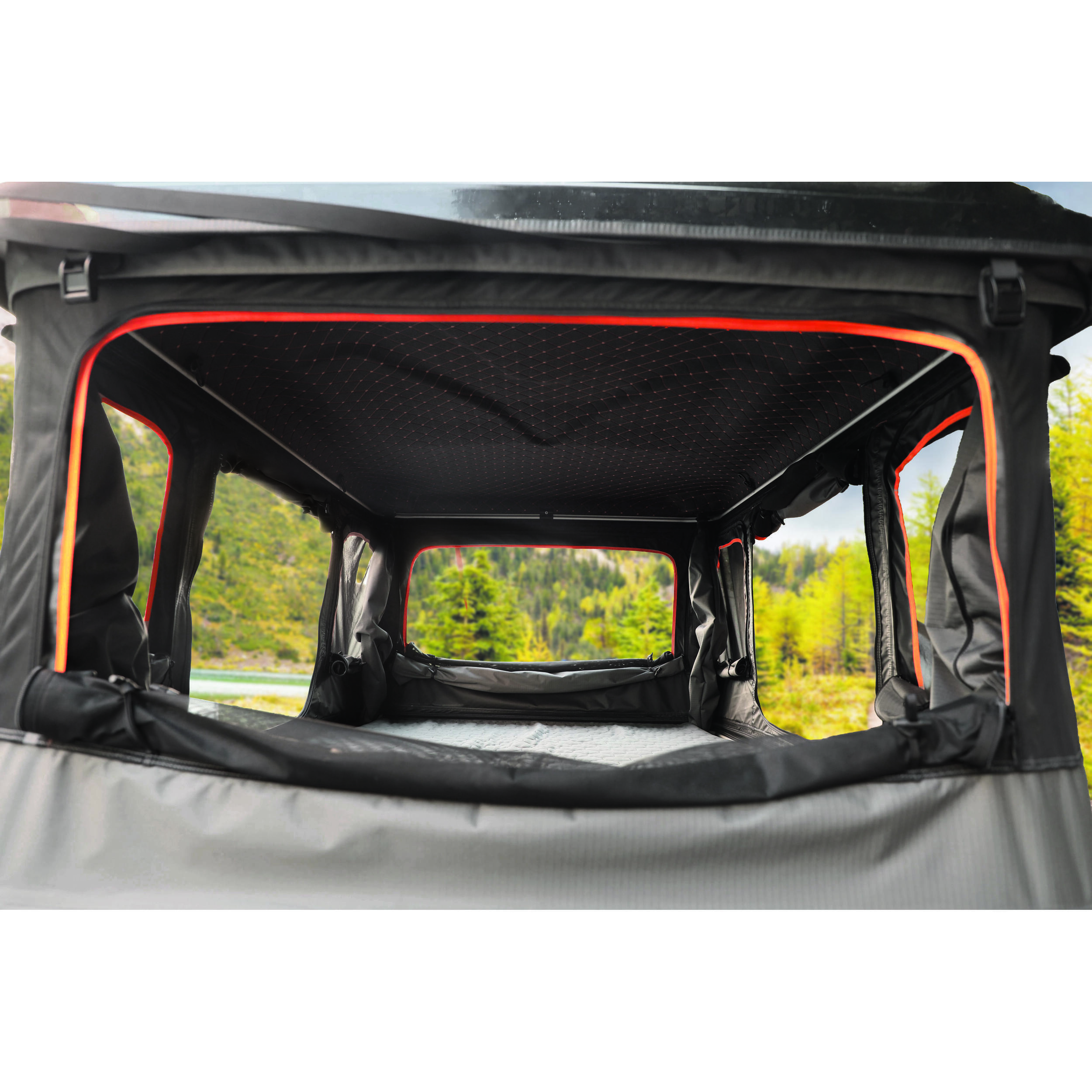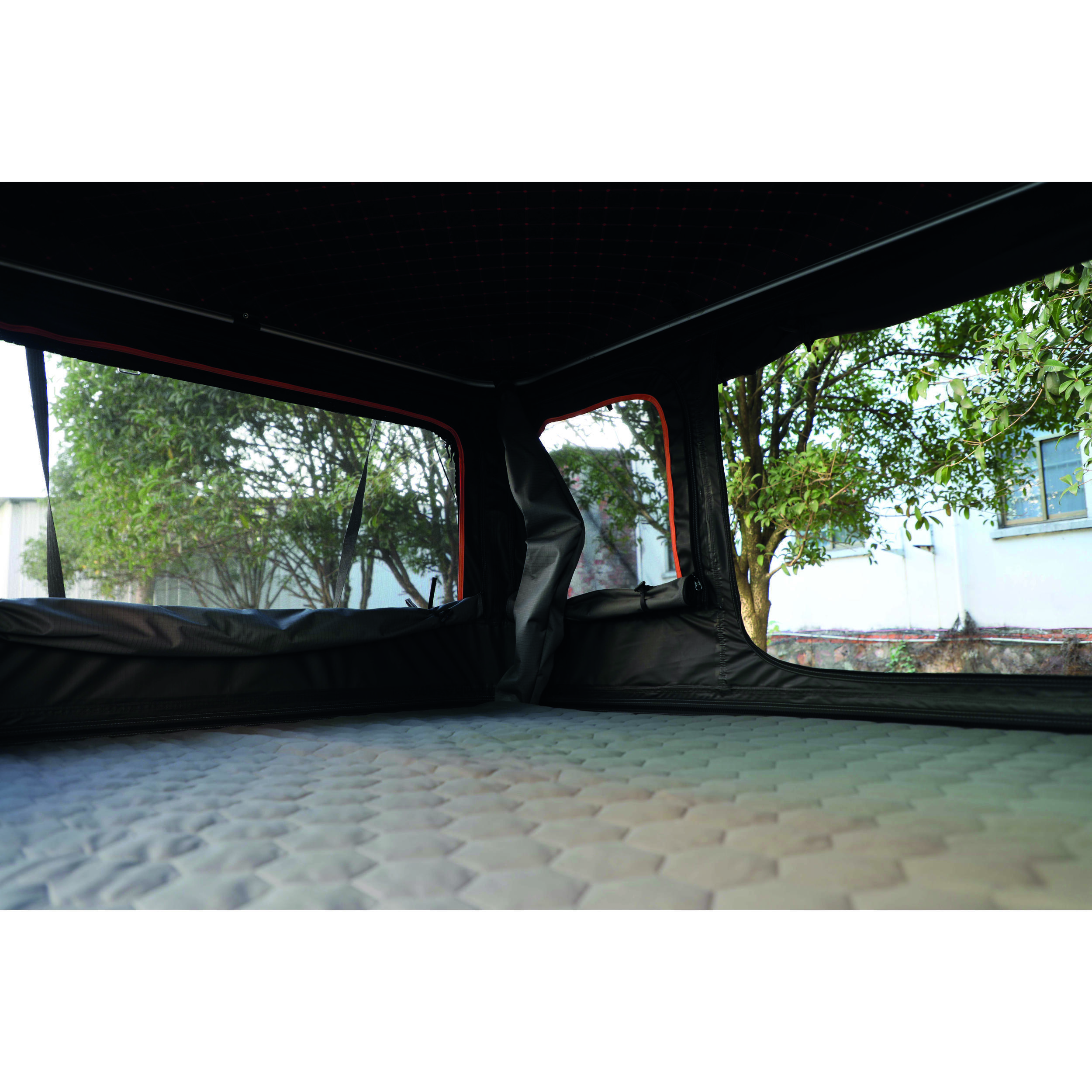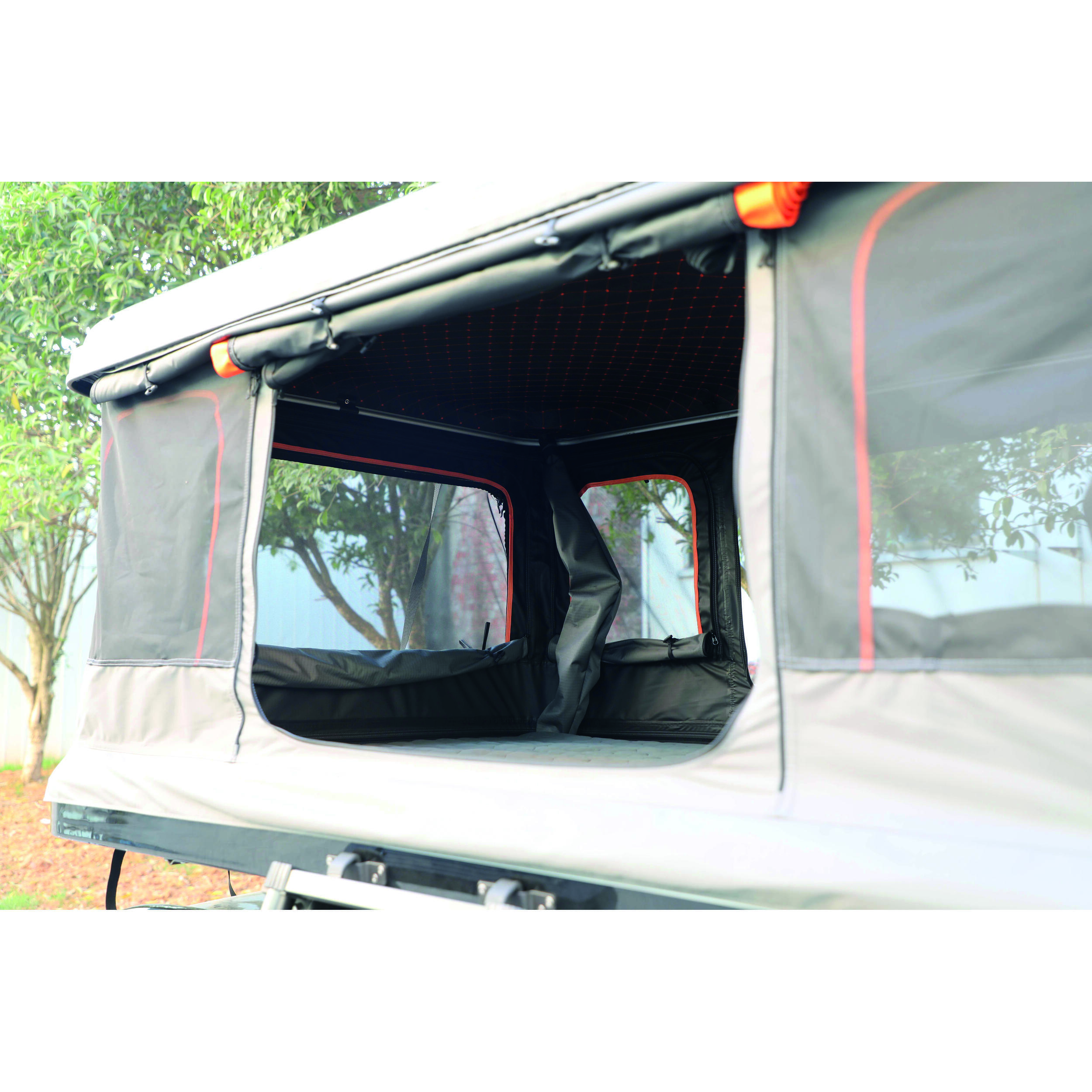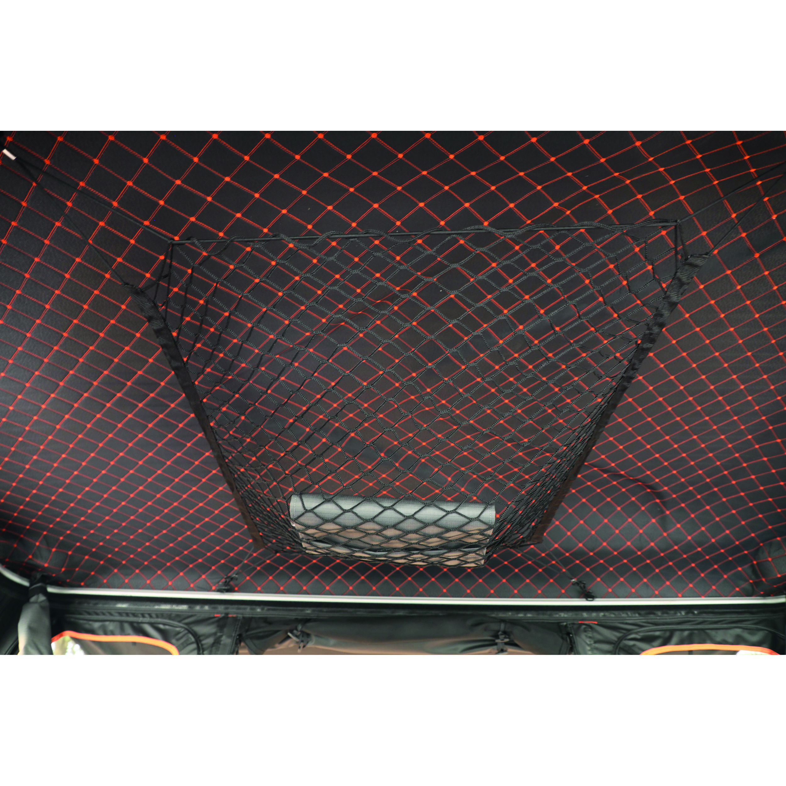 La tente dispose d’un système d’ouverture semi-automatique avec quatre vérins à gaz, protégés par un tissu.