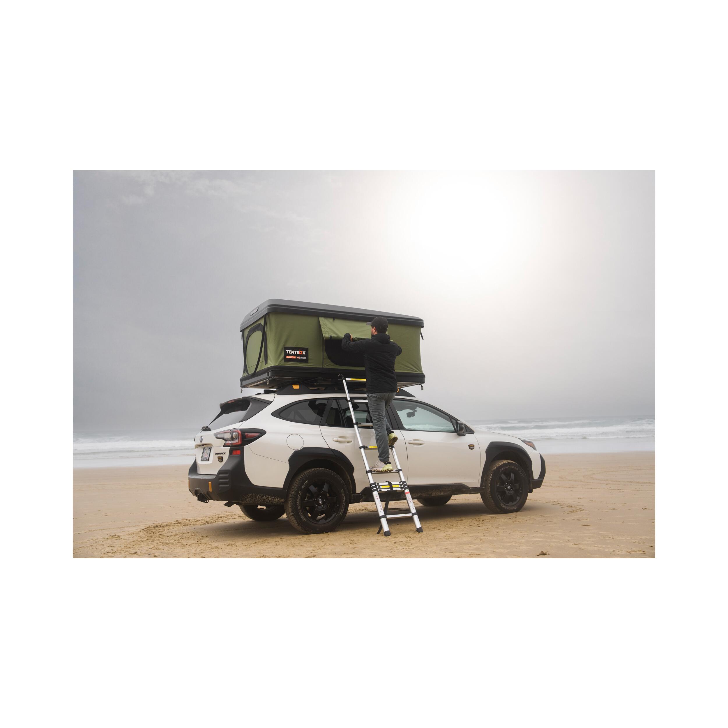 Avec son échelle télescopique extensible jusqu’à 2,6 m, l’accès est facile quelle que soit la hauteur de votre véhicule. La coque rigide protège efficacement la structure intérieure pendant le transport et améliore l’aérodynamisme sur la route. En quelques instants, vous transformez votre toit en espace de repos tout confort, sans sacrifier l’espace intérieur de votre véhicule.