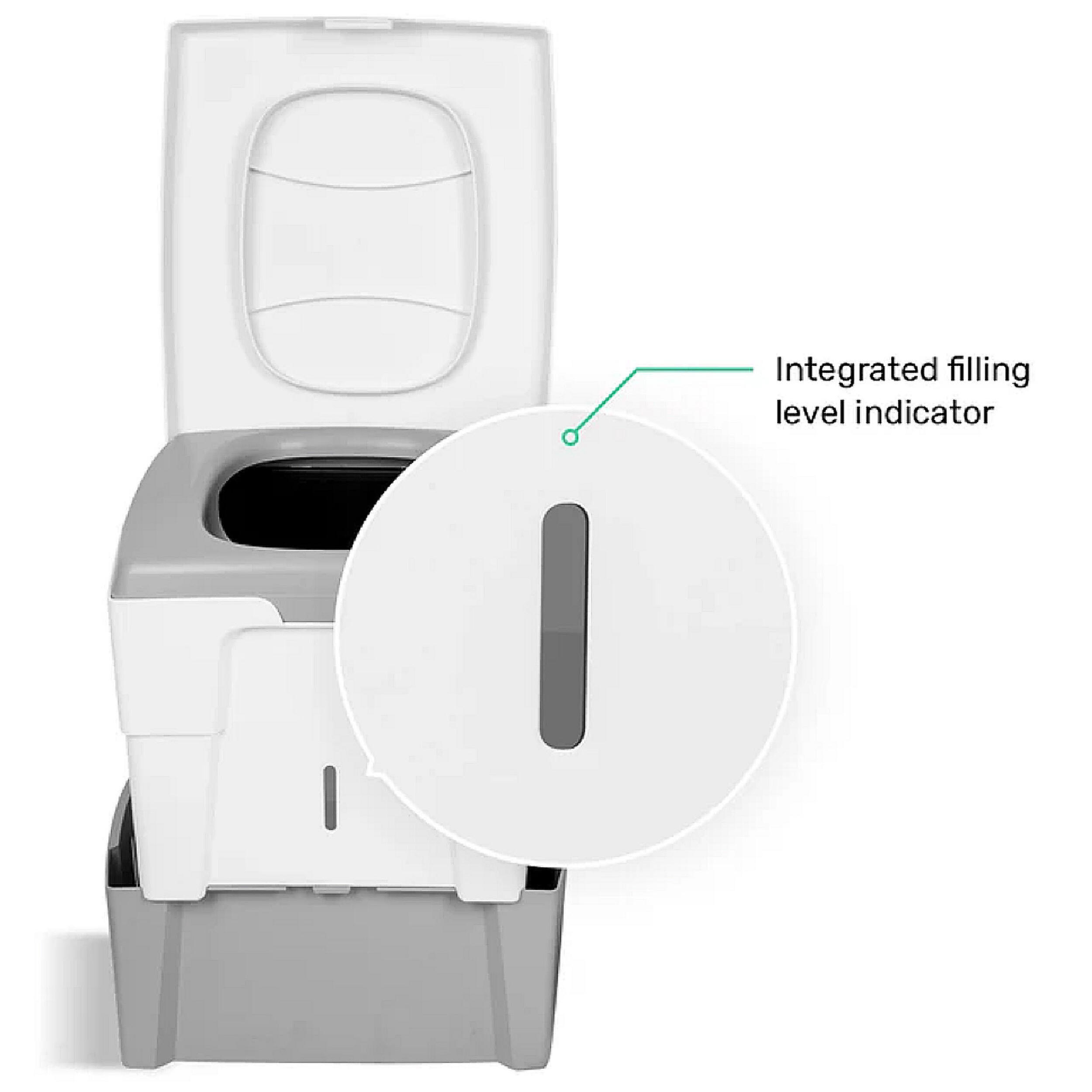Les deux versions se rangent facilement grâce à leurs dimensions compactes. Le poids varie selon le modèle, de 3,3 à 4,2 kg. Le transport est facilité par la conception robuste et la fermeture étanche du couvercle. Les récipients se retirent séparément pour une vidange rapide. Les matières solides peuvent être jetées avec les déchets ménagers et les liquides éliminés dans des toilettes classiques ou dilués pour d’autres usages. Le nettoyage se fait simplement grâce au polypropylène résistant.