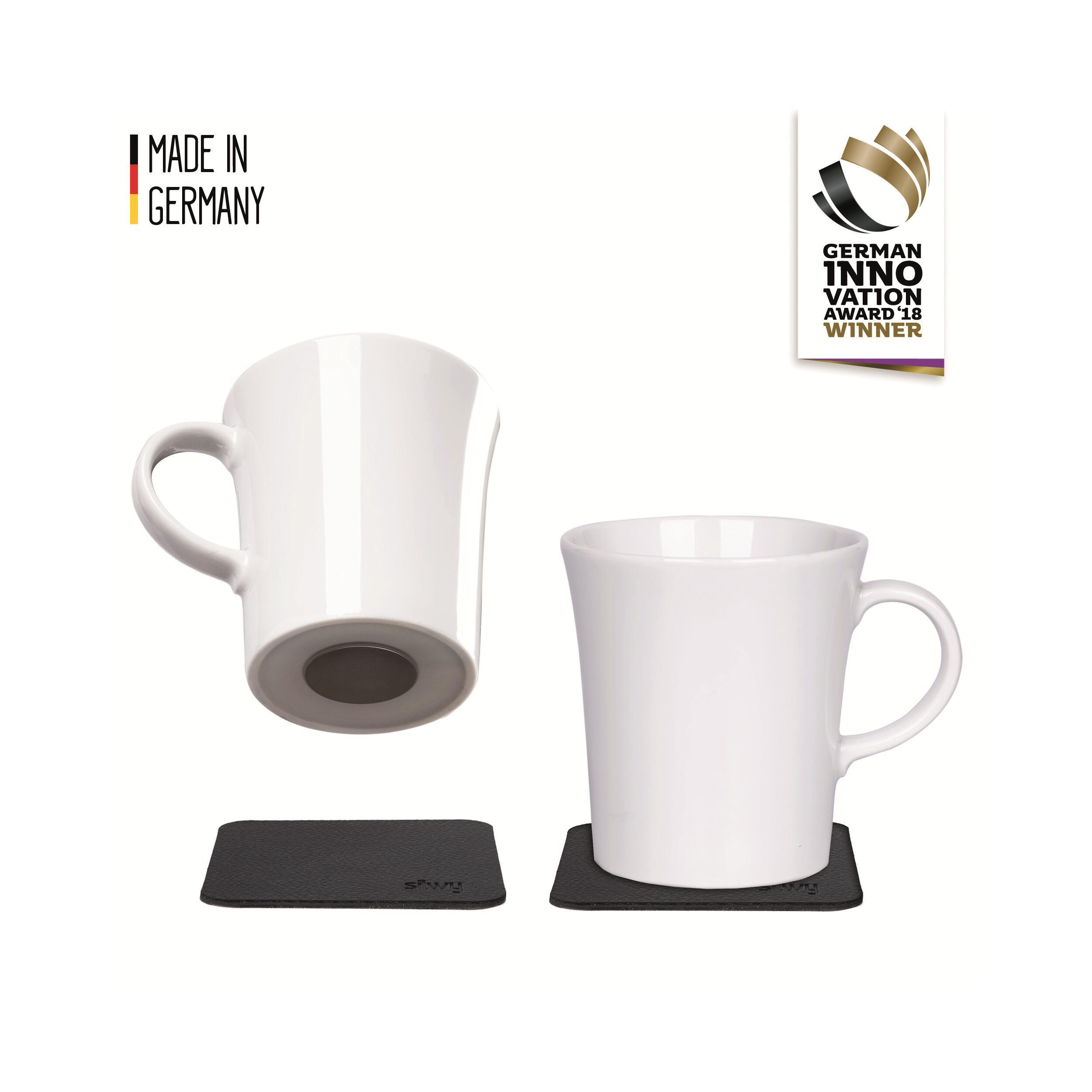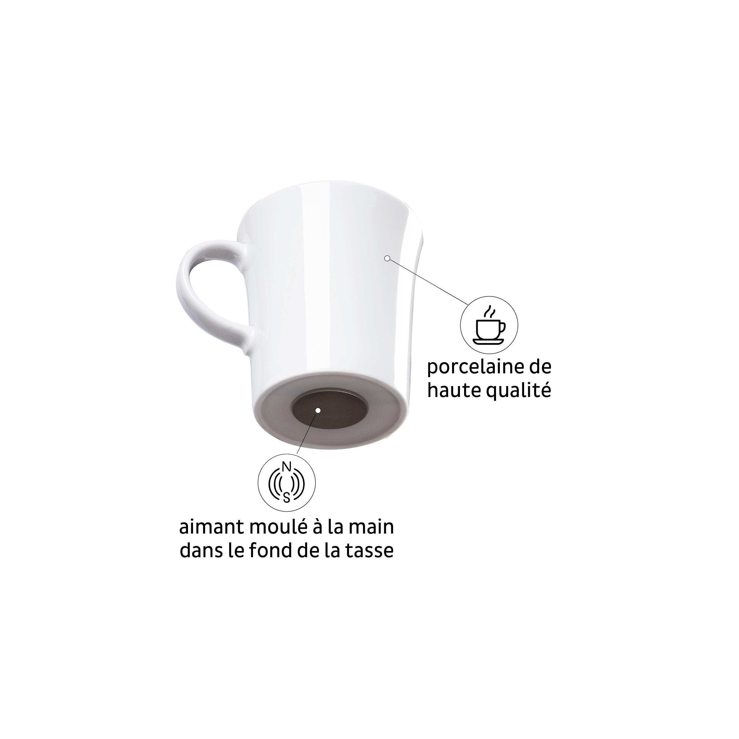 Tasses classiques et stables en porcelaine avec un aimant moulé dans le fond de la tasse. Les pads sont lavables et réutilisables.