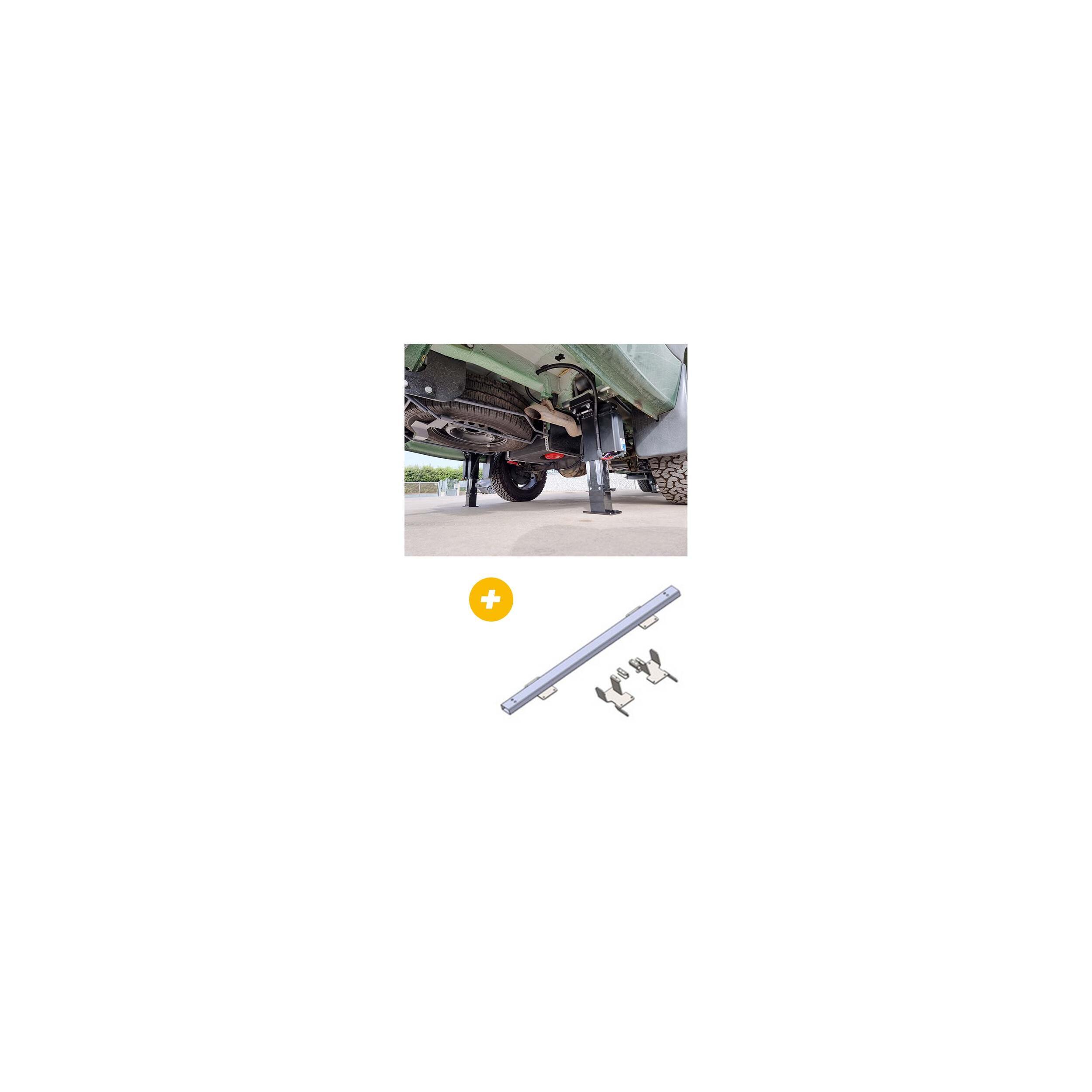 Afin d'assurer et renforcer la rigidité du châssis sur la partie arrière, l'ajout d'un kit d'adaptateurs spécifique au modèle du véhicule (non inclus) contenant les interfaces vérins/châssis et une barre de renfort de rigidité pour l'arrière est indispensable.